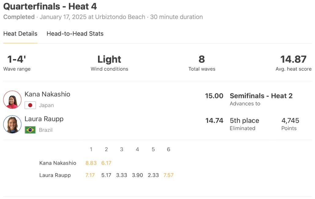 セットでオーバーヘッド、少し風の影響を受けてうねりがヨレ気味なコンディションとなった中、注目の日本人選手の活躍は、クォーターファイナルで1本目の波からこの日のハイエスト・シングルスコアとなる8.83ptを叩き出した中塩佳那が、ブラジル代表のLaura Rauppを相手に見事勝利してセミファイナル進出を決めた!!