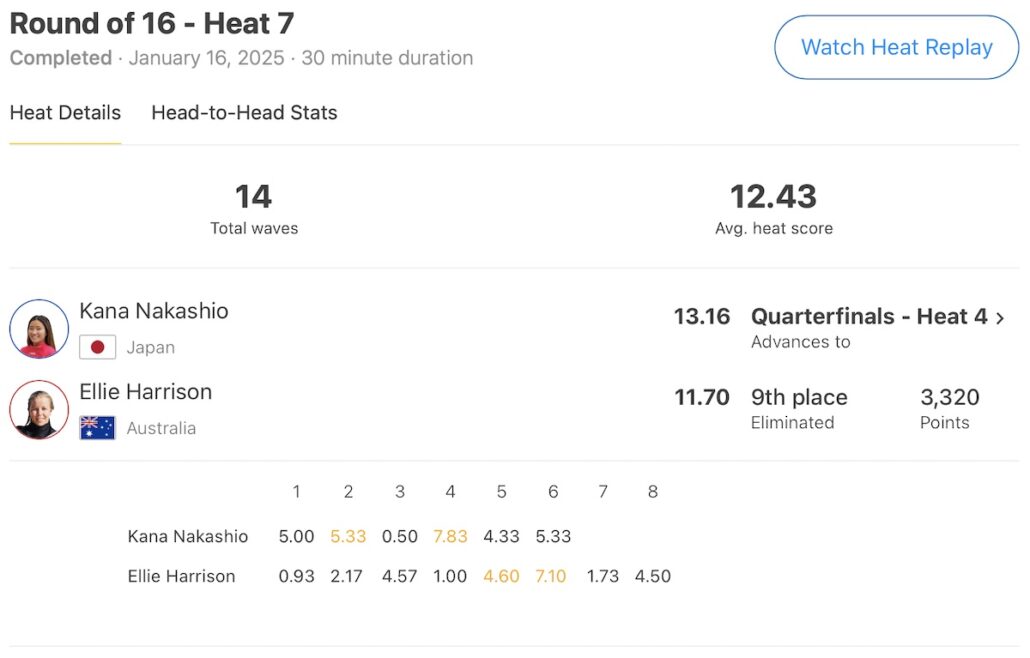 その一方で、ラウンドオブ16まで勝ち上がっていた川瀬心那が、ヒート5で昨年のプロジュニア・ワールドチャンプSierra Karrに敗退となり、この前日の1/16(木)に行なわれたMENSラウンドオブ16で敗退となった岩見天獅と同様、今大会を9位でフィニッシュすることとなった。