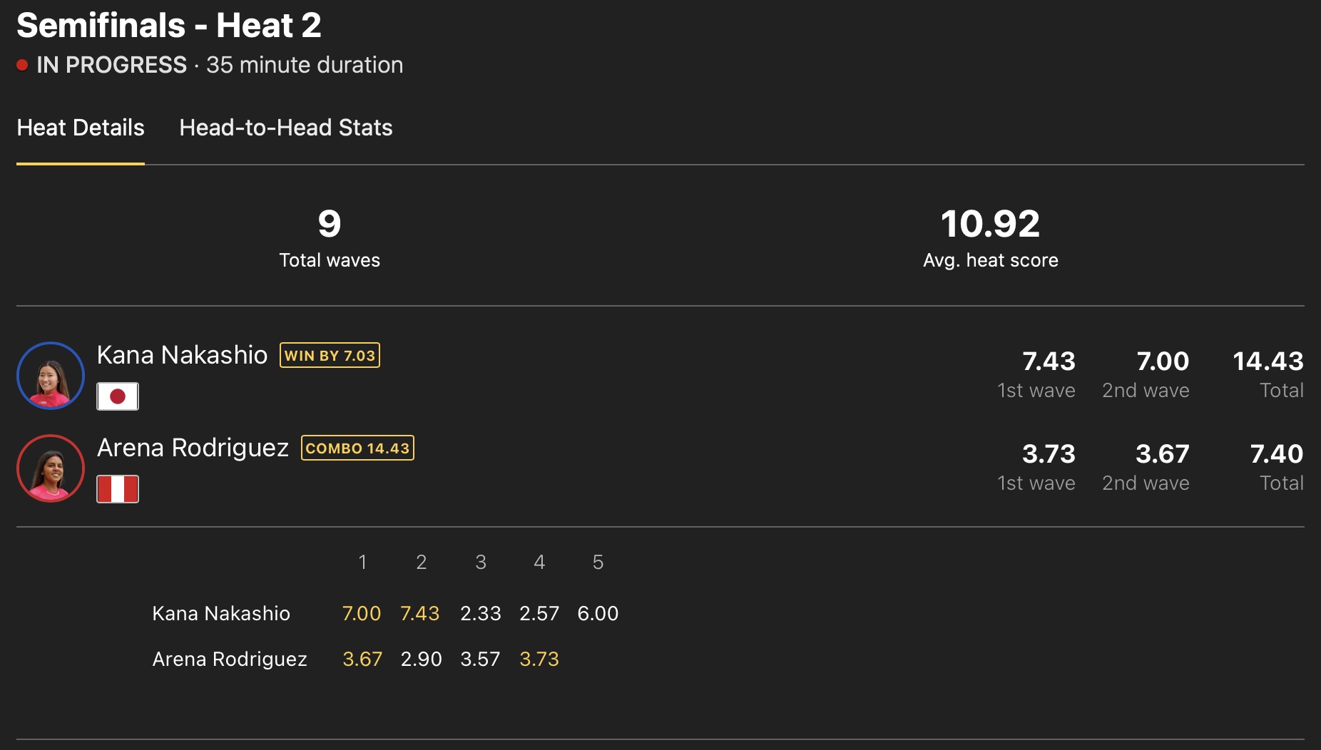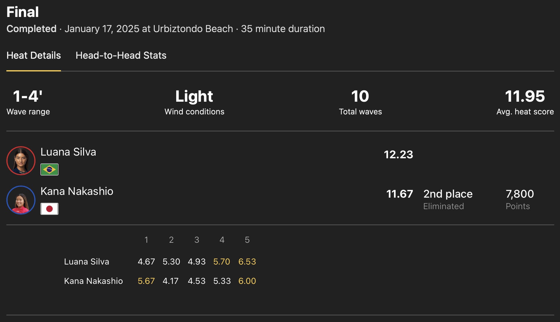 ヒート後半までLaura Silvaがリードする状況の中、最後の1本で6.00ptをマークした中塩佳那が逆転1位となったが、Laura Silvaが最後に掴んだ波で6.53ptと叩き出したことにより逆転返しを喰らう展開となってしまい、Luana Silveがプロジュニア・ワールドチャンプに輝いた。