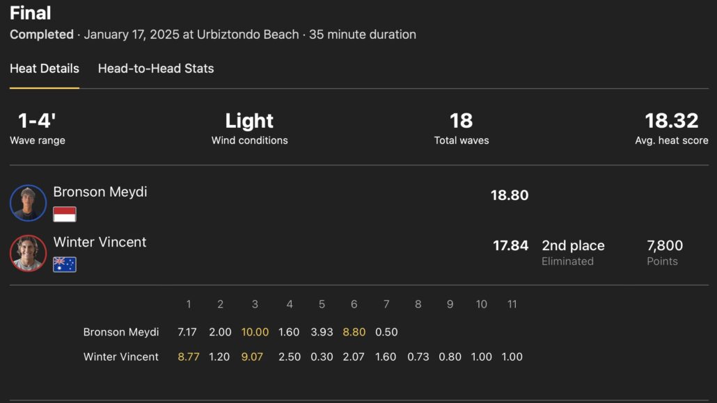 1本目で8.77pt、3本目で9.07ptをマークしたWinter Vincentにコンビネーション・シチュエーションに追い込まれる絶望的な状況で逆転を狙うBronson Meydiが、3本目で10ptを叩き出し、さらに6本目の波でアーリーウープからのリエントリーで8.80ptをスコアしてバックアップをまとめると、まさかの逆転1位の座に躍り出る!