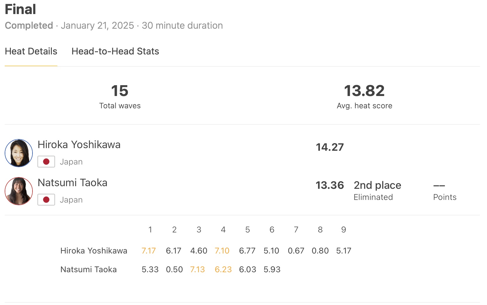 「ファイナルは自分らしいサーフィンができるように、もちろん田岡選手もすごく強くてかっこいいサーフィンをするので自分も精一杯ライディングできるように頑張りました。優勝できて本当によかったです。応援してくださった皆様、本当にありがとうございました。」