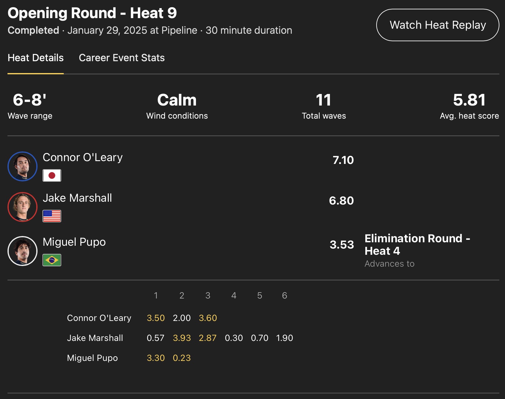 ハイスコアにつながるポテンシャルのある波が全く来なかったと言って過言ではないタイミングでヒートがスタートとなった中でも、持ち前のパワフルなターンでスコアをまとめ、Jake MarshallとMiguel Pupoの追従を許さなかったコナー・オレアリー。