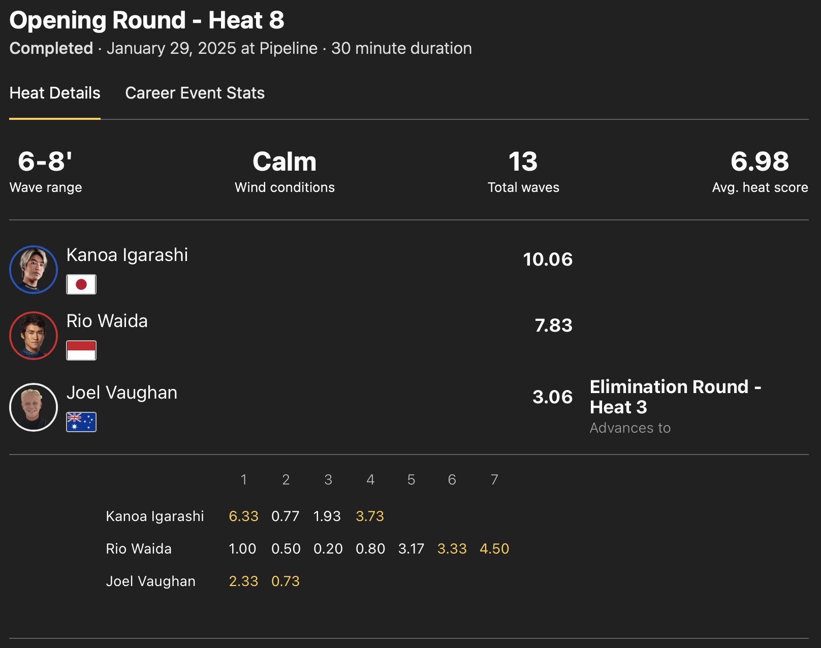 じっくりと波を待ってヒートのハイエストスコアとなる6.33ptをバックドアでマークし、和井田理央、そしてルーキーJoel Vaughanを抑えた五十嵐カノア。落ち着いた試合運びが経験値の差を物語る余裕の1勝となった。その一方で、和井田理央は最後まで逆転を狙って波を掴み続け、2位でラウンドオブ32へ進出。ラストウェイブのフィニッシュをメイクしていたら逆転1位の可能性すらあったであろうそのサーフィンは恐るべしポテンシャルの高さを感じさせた。