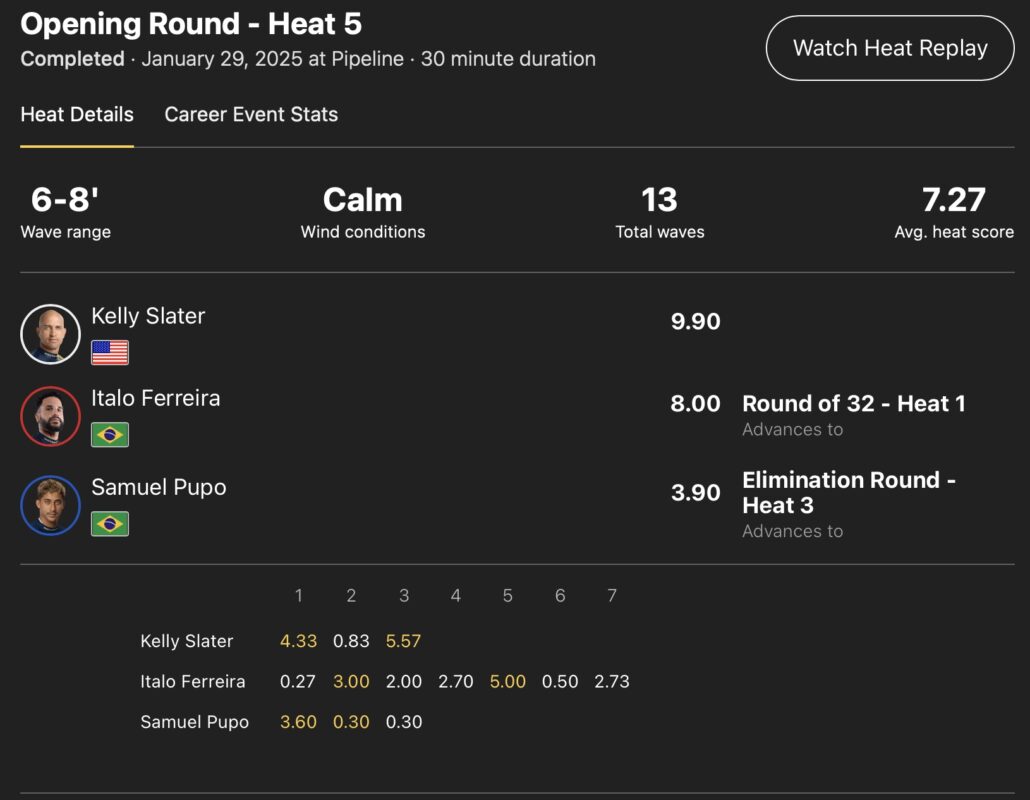 Colorsmag的注目の11×ワールドチャンプKelly Slaterは、ワールドチャンプItalo Ferreira、そしてSamuel Pupoといったブラジルの強豪選手2名を相手に1位でラウンドアップ。さすがのひとこと。