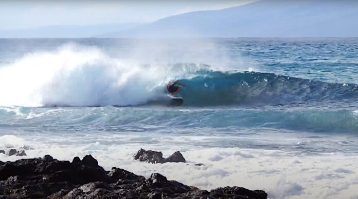 決してコンテストの枠に縛られない型破りなオリジナルスタイルを武器とするそんな彼が、普段から愛用するCatch Surfのソフトボードで岩スレスレの掘れ掘れ波なのにそれすら楽しむファンサーフ・セッションを決行!