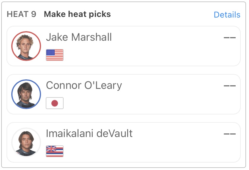 注目の日本代表選手であるコナー・オレアリーはヒート9でJake Marshall、Imaikalani DeVaultと対戦。