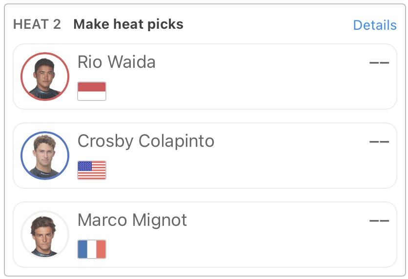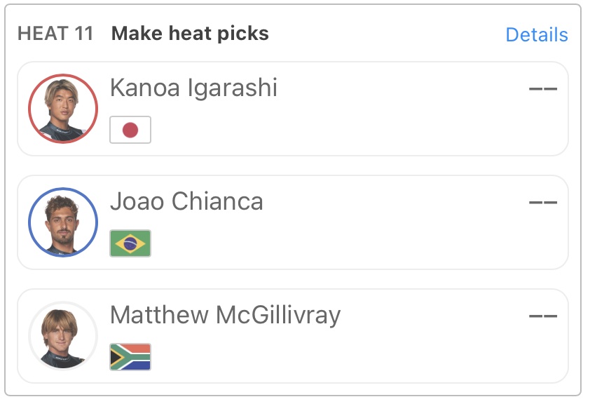 五十嵐カノアはヒート11でJoao Chianca、Matthew McGillivrayと対戦。