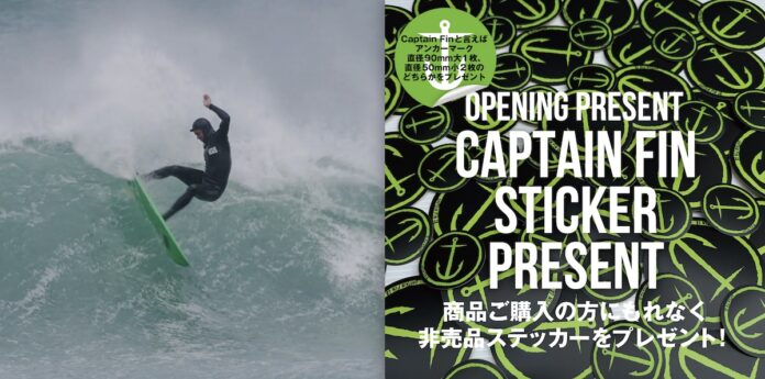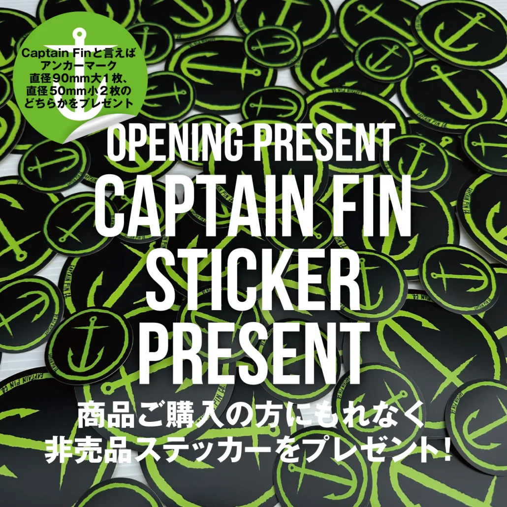 現在、オンラインストアでアイテムを1点購入すると、もれなくCaptan Finのオリジナル・ステッカー直径90mm大1枚、もしくは直径50mm小2枚のいずれかがもらえるオープン記念キャンペーンを開催中。