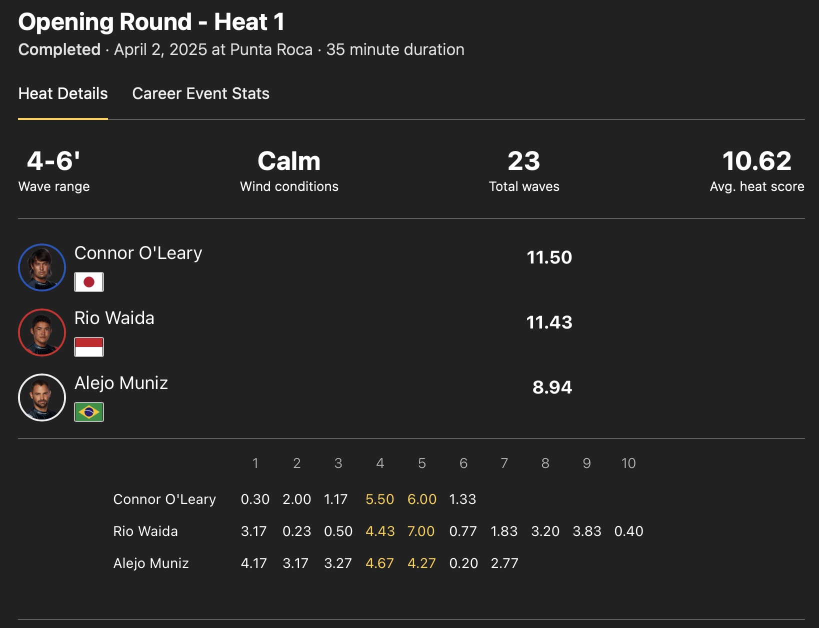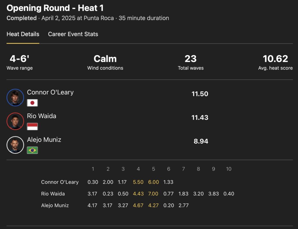 和井田理央が5本目にこのヒートのハイエストスコアとなる7.00ptをマークして1位のポジション、ミドルサイズでスコアを重ねるAlejo Munizが2位をキープする中、いい波を全くつかむことができず苦戦を強いられるコナー・オレアリーだったが、残り12分を切ったところで掴んだ4本目に5.50ptをスコアすると、残り7分を過ぎたところでキャッチした5本目にパワフルなバックサイド・リップを連発するライディングを決めて6.00ptをマーク!