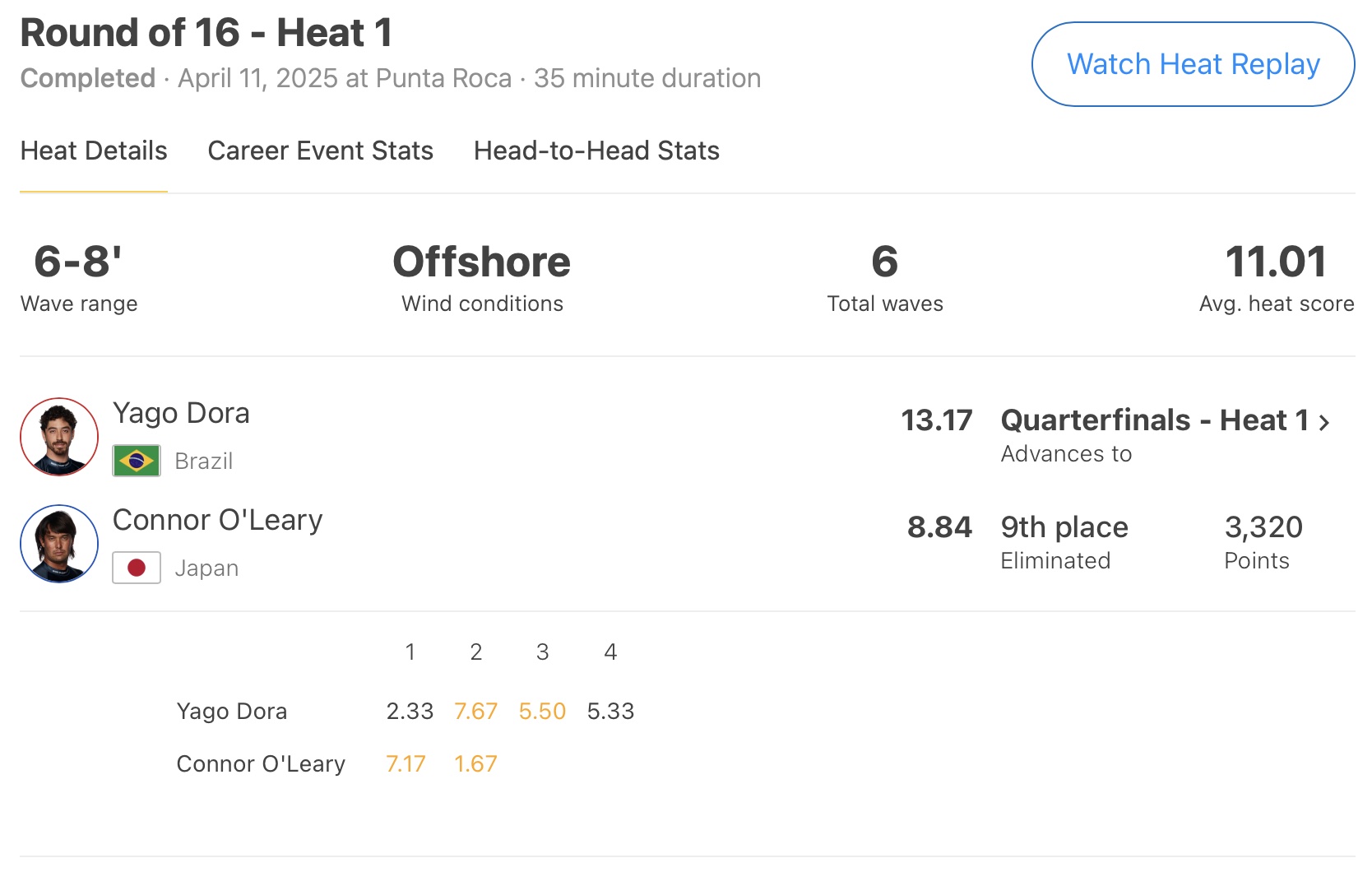 MENSはJordy Smithが通算CT7勝目を、WOMENSはGabriela Bryanが2度目の優勝を決めた中、注目の日本代表選手であるコナー・オレアリーは、コンテストDAY7に行なわれたラウンドオブ16でYago Doraに敗退となり、9位でフィニッシュすることとなった。
