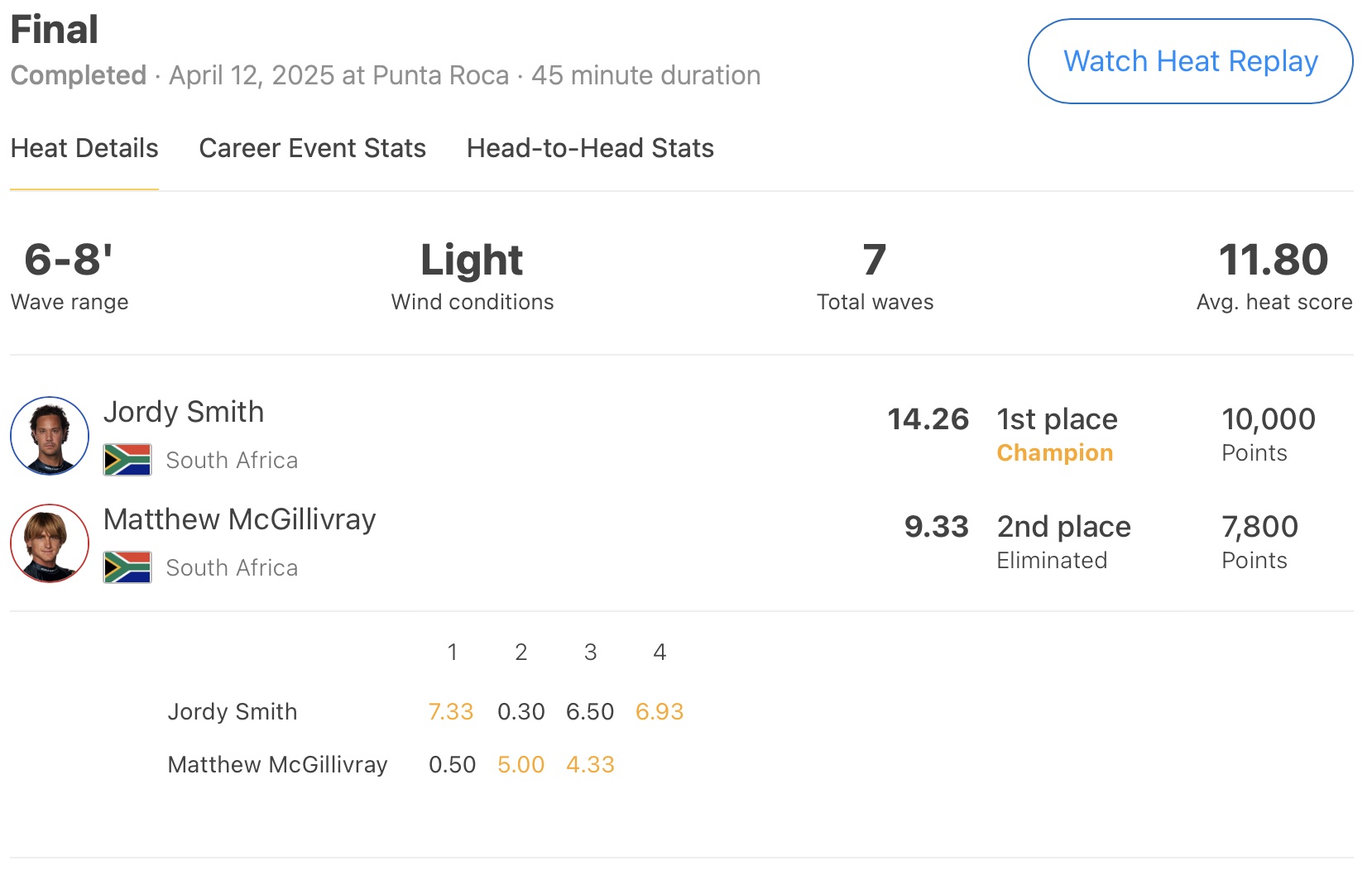 ファイナルでは同じく南アフリカ出身の後輩CTサーファーMatthew McGillivrayを破り、CT7勝目を挙げた。