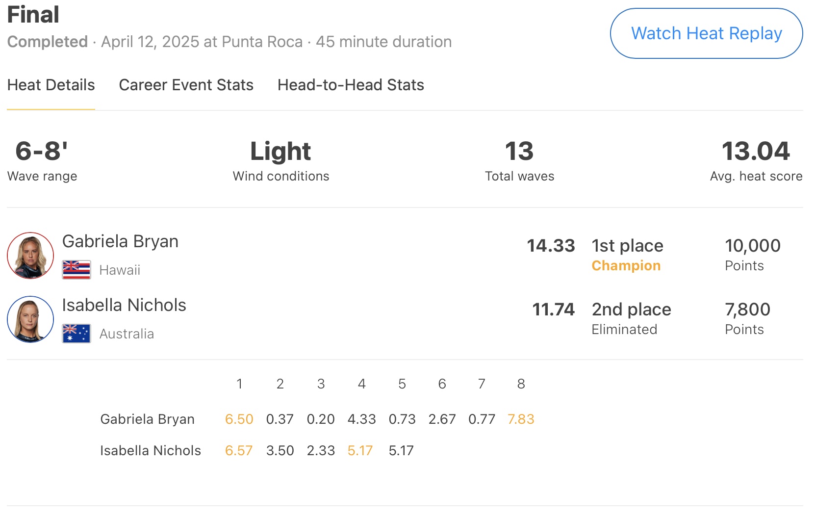 「ファイナルは本当にジェットコースターのような展開でした」Gabriela Bryanは言った。「いくつかミスもしましたが、『あと1本波乗れたら、絶対にミスはしない』と思っていました。最高の気分です。エルサルバドルで素晴らしい時間を過ごすことができました。ここが大好きです。ライトハンドのポイントブレイクが私のお気に入りで、ここは世界でも最高の場所の一つです。ここで試合に出場できることは素晴らしい経験であり、周りの仲間も最高です。故郷で応援してくれている皆さん、皆さんのことを愛しています。そして、最高の時間を過ごせたエルサルバドルに感謝します。」