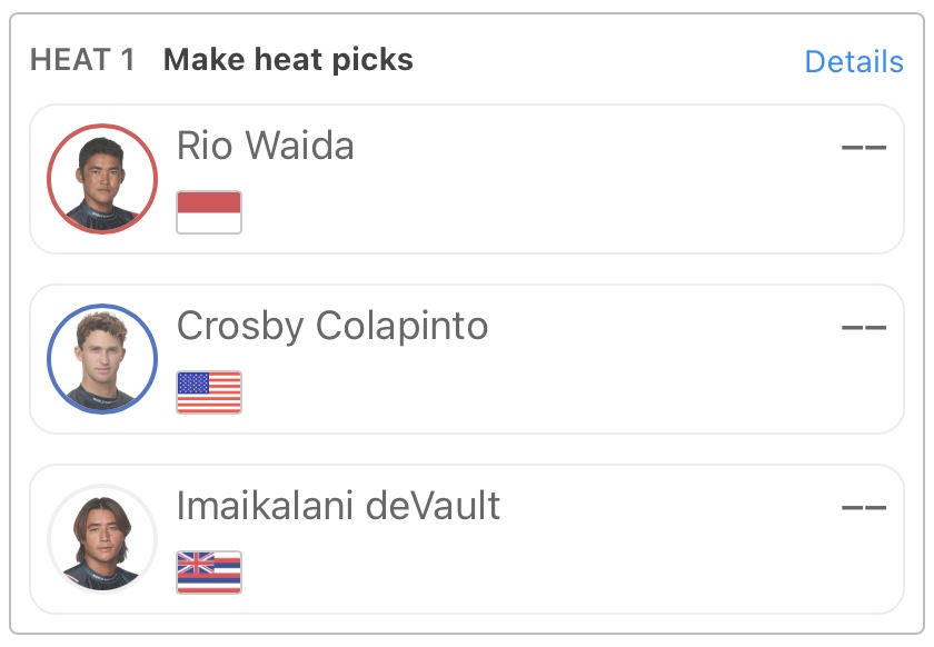 また、インドネシア代表の和井田理央はヒート1でCrosby Colapinto、Imaikalani deVaultと対戦する。