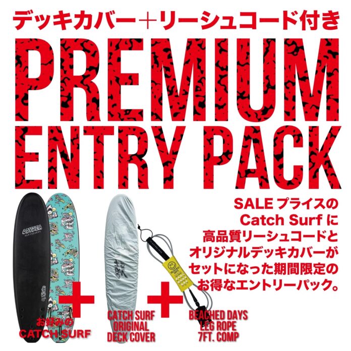 このレベルや波のコンディションを問わずファンサーフ可能な超絶人気モデルを対象に、最大30%オフ、さらにCatch Surfオリジナル・デッキカバーとリーシュコードがもらえるプレミアム・エントリーパック・キャンペーンが開催中!