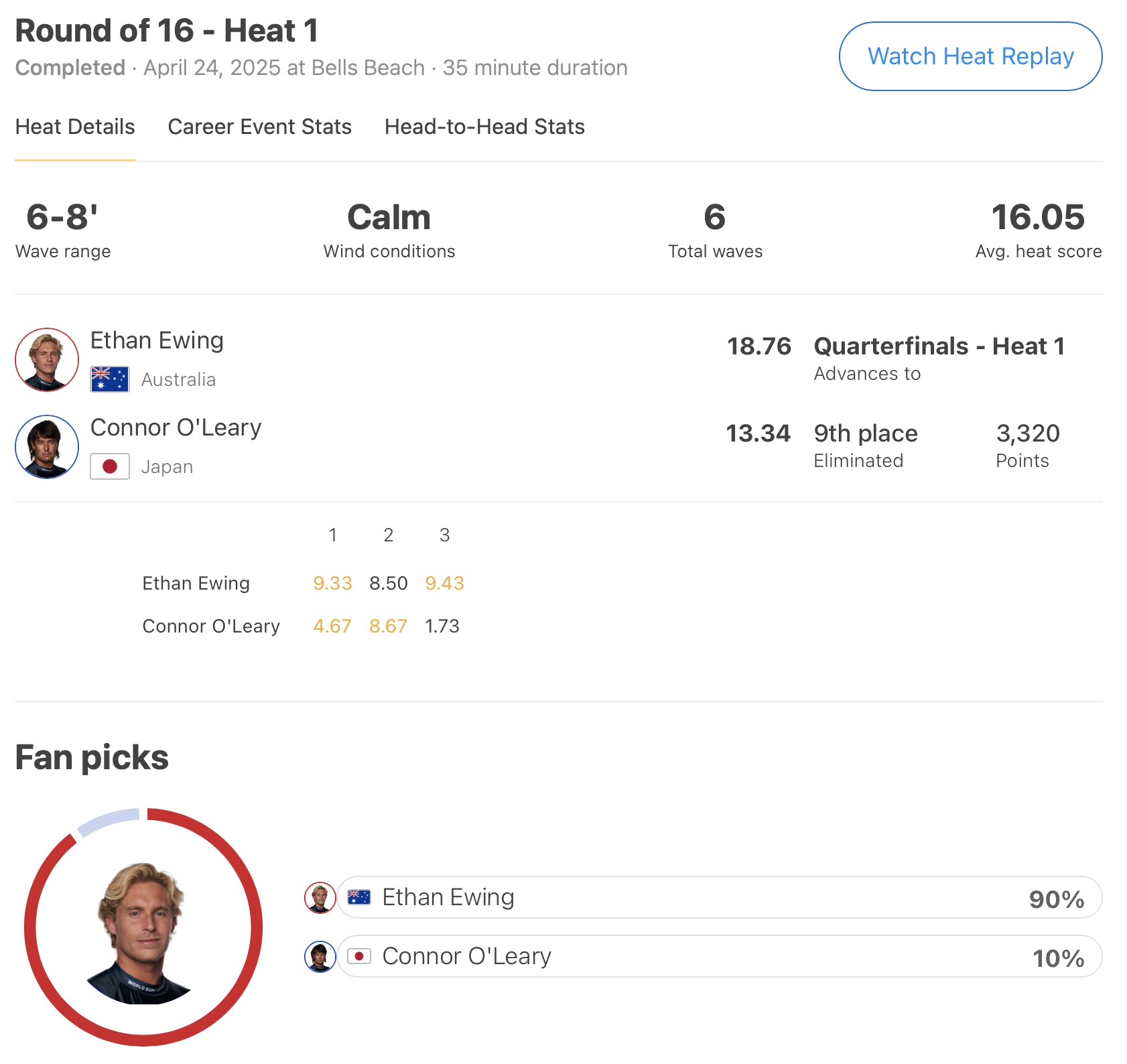 「本当に楽しいヒートでした」Ethan Ewingは言った。「ここは安定して素晴らしい波に恵まれていたので、波に乗れてボウルがそれを返してくれたのは嬉しかったです。ヒート全体が最初から自分に有利に進んだように感じます。序盤にセットウェーブをいくつか掴むことができ、それが良い流れを作ってくれて、残りの波の中で注目を集めることができました。本当に楽しかったです。」