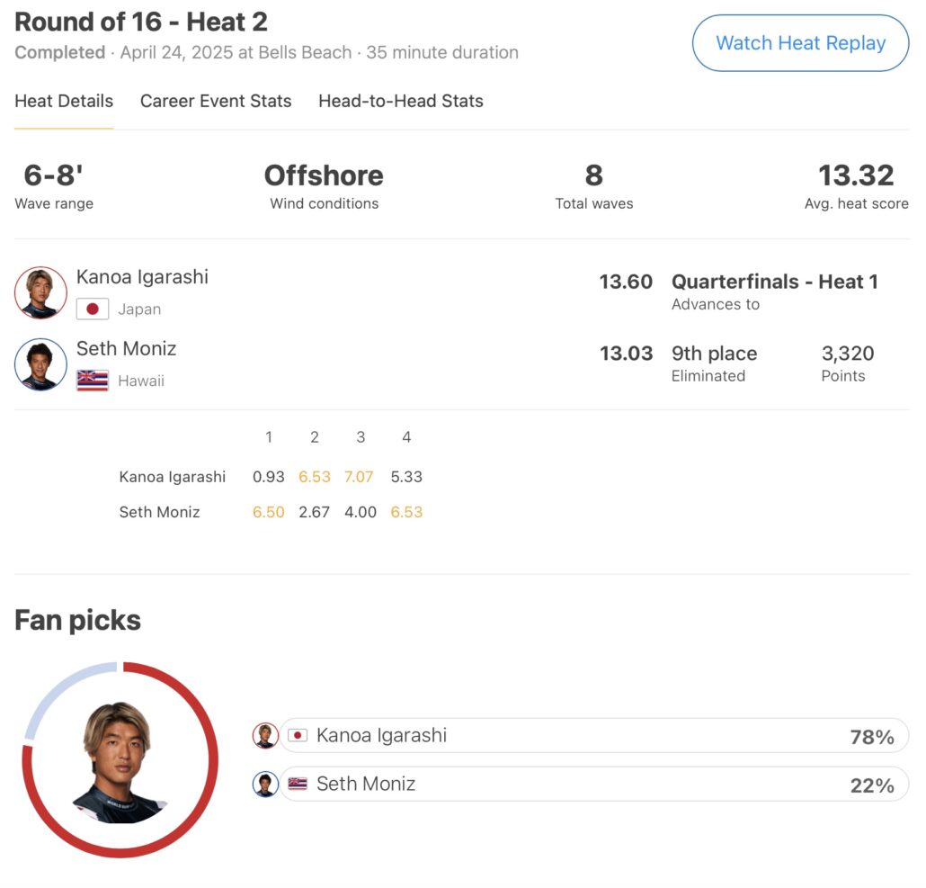 五十嵐カノアがここでEthan Ewingの勢いに歯止めをかけてくれることに期待したい!