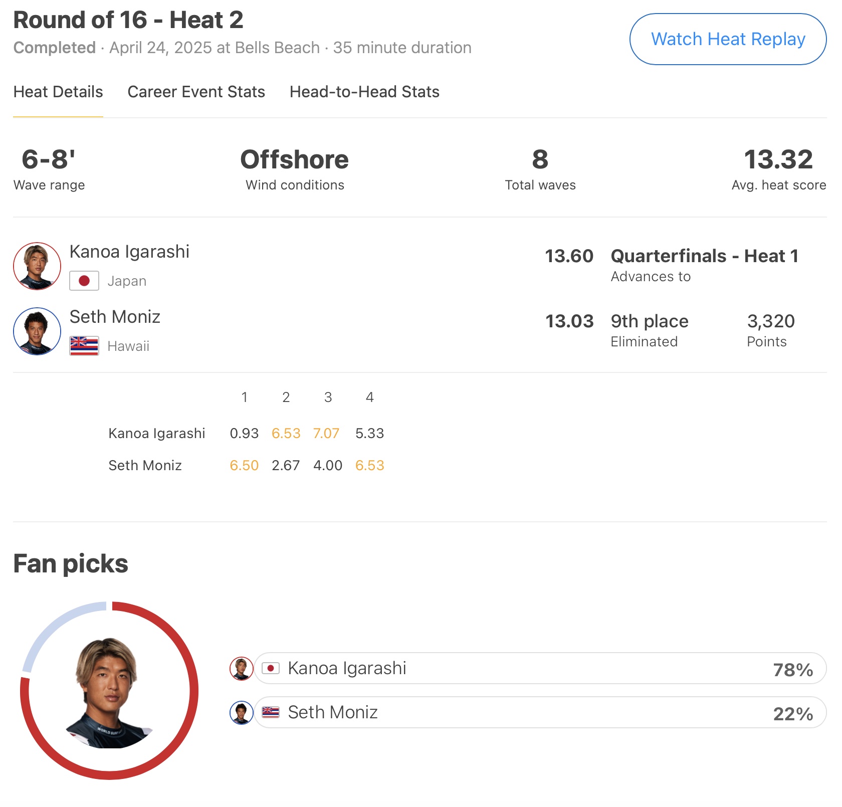 注目の日本代表選手たちの活躍は、ラウンドオブ16のヒート2でSeth Monizと対戦した五十嵐カノアがSeth Monizを相手にトータルスコア13.60ptをマークし、見事クォーターファイナルへ進出を果たした!
