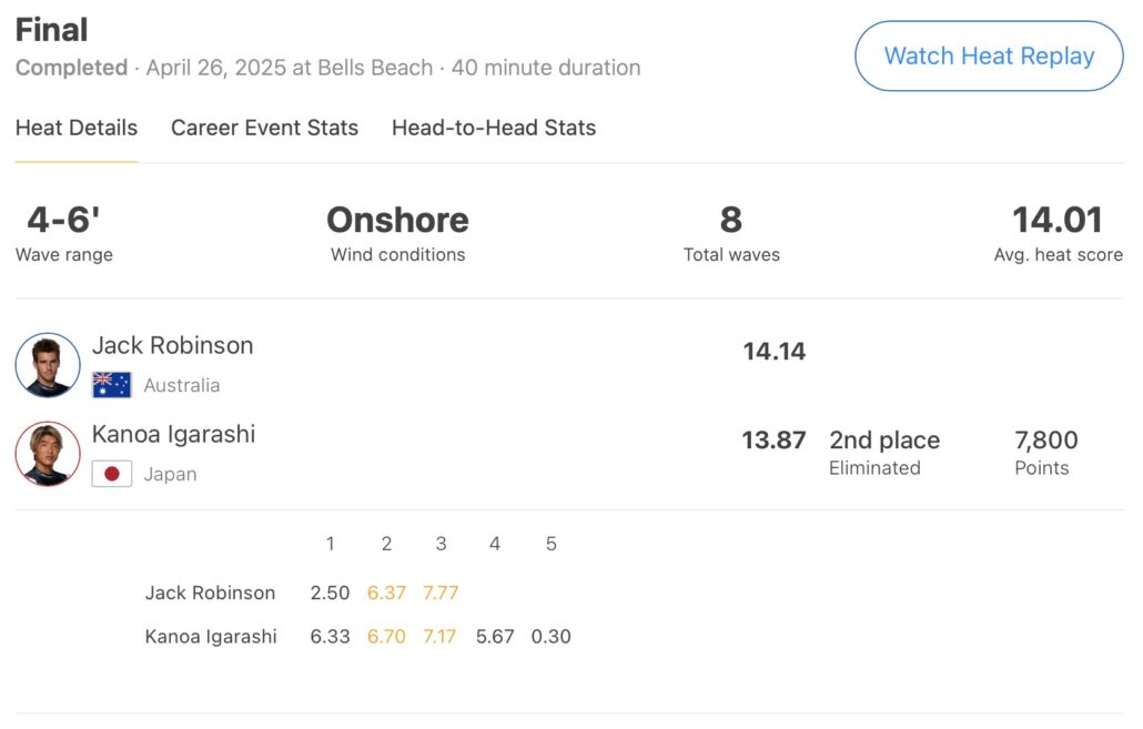 「本当に興奮しています。ファイナルの日に目覚めるだけでも、いつも素晴らしいです」と五十嵐は言った。「決勝直前にベルの音が流れているのを聴くと、決勝に出場していることを実感できて、本当にあの感動はいつも最高です。Jack Robinsonとは今週ずっと一緒にいたので、こうしてファイナルで戦えたことが不思議な感じだし、すべてがうまくまとまったと感じています。だからどんなことがあっても全力で戦うつもりでした。また優勝争いに加われて本当に嬉しいです。最近JSに乗り換えたんだけど、ボードの調子も最高なので、これからオーストラリアで続くCT戦に向けて、いいスタートを切れて本当にワクワクしています。」