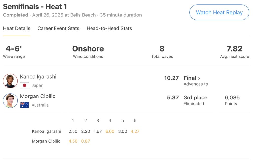 注目の五十嵐カノアは、セミファイナルでMorgan Cibilicを抑えて自身のキャリア3度目のCTファイナル進出を果たした。