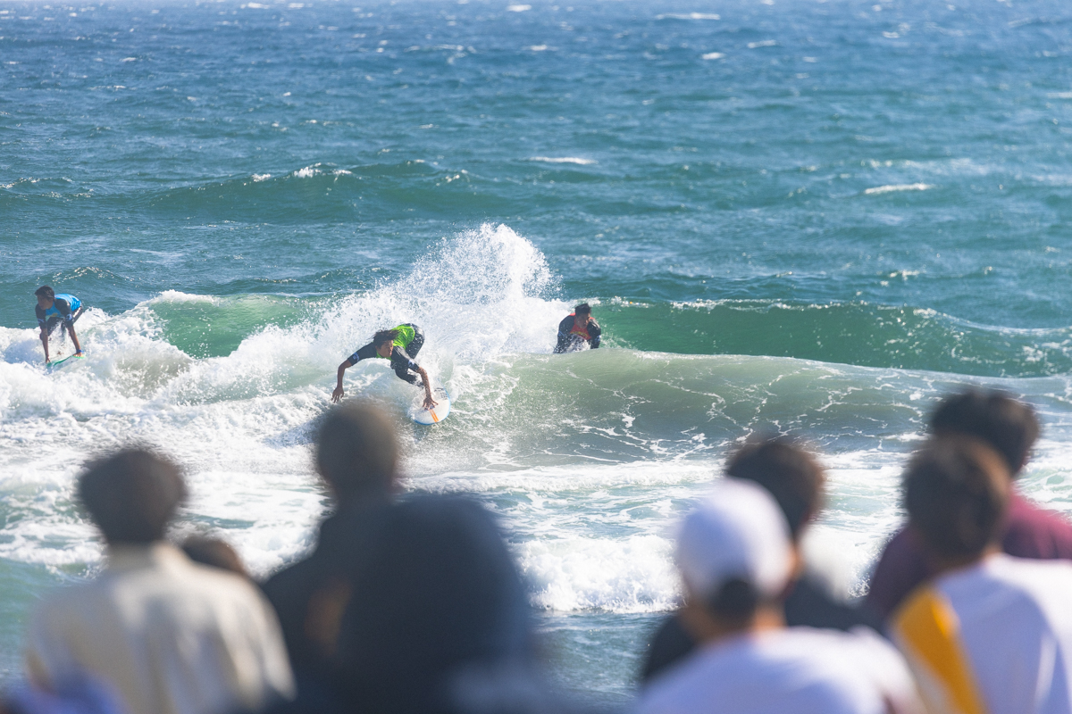 2025年日本一のプロジュニア決定戦のSMジュニアのファイナルでの一コマ。優勝に向けてスプレーを上げる足立海世。その裏の波ではレギュラー方向に向かおうとする岡野蓮とグーフィー方向に向かおうとする山本來夢。ファイナリスト全員が優勝を目指して積み重ねてきた努力。燃え尽きることのない熱い想い。この一瞬に全てを賭ける。