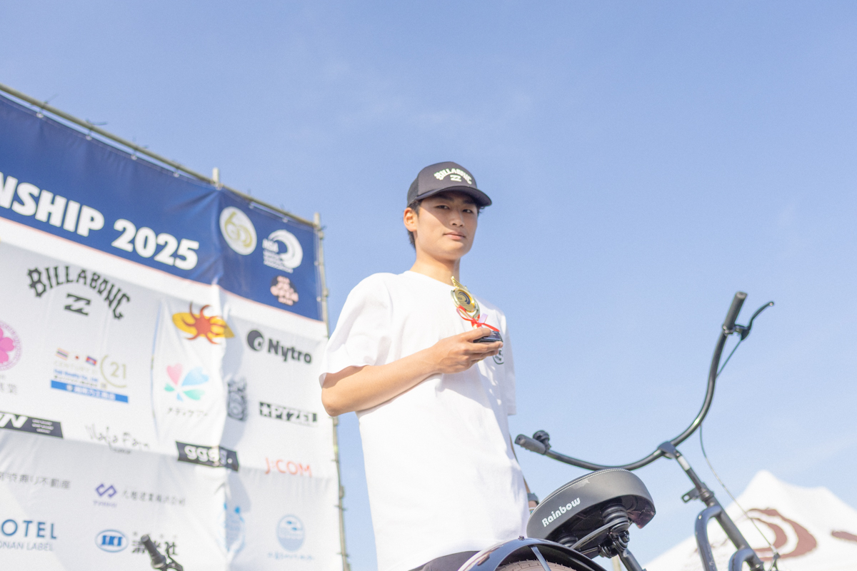 長髪から気合いの丸坊主で試合に挑み、ファイナルではスタイリッシュにテールを蹴り込むソリッドなリップを連発し、誰が見ても1番のサーフィンを魅せてSMジュニアメン優勝を勝ち獲った大阪出身の大住唯斗。SM JuniorMen winner, Yuito Osumi.
