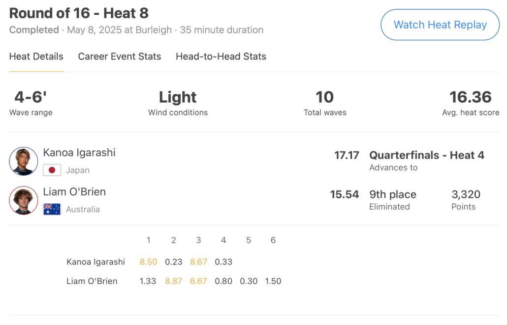 注目の五十嵐カノアは、ラウンドオブ32のヒート16でIan Goveiaを僅差で抑えると、迎えたラウンドオブ16のヒート8では地元ゴールドコーストのLiam O’Brienと対戦。