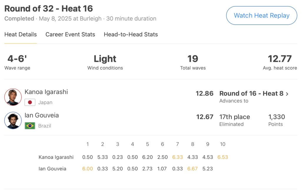 「パドルアウトした時、彼は本当に倒すのが難しくなりそうな顔をしていて、それを痛感しました。2本エクセレントスコアを出せる波が必要だと自分に言い聞かせました。2本波を掴んだ後もまだ時間はたっぷり残っていたので、とにかく戦略的に攻めるしかありませんでした。地元ブレイクでCTに出場できるなんて、本当に素晴らしい経験だったに違いありません。彼にとっても、観客の応援で胸がいっぱいだったでしょう。僕も笑顔になりました。僕はただその興奮を味わい尽くし、彼も同じように感じているのが分かりました。」