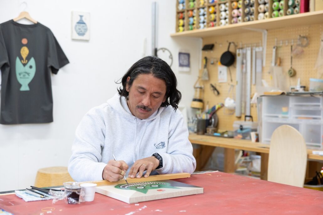 1981 年、岐阜県生まれ。1997 年にブレイキンとグラフィティを始め、2001 年 に渡米。カリフォルニアで本場のストリートアートに出会い、アート活動を開始 する。その後サンフランシスコにてバイクメッセンジャーとなり、帰国後も東京 でメッセンジャーと創作活動を続ける。現在は愛知県渥美半島に制作拠点を構 え、サーフィン、スノーボード、フィッシングをライフワークとしながら絵を描 く日々を過ごす。これまでに日本、アメリカ、中国、オーストラリア、カナダ、 メキシコ、台湾、香港、フィリピンなどでグループ展や個展を開催。壁画制作を 中心に据え、さまざまな企業とのコラボレーションも展開している。