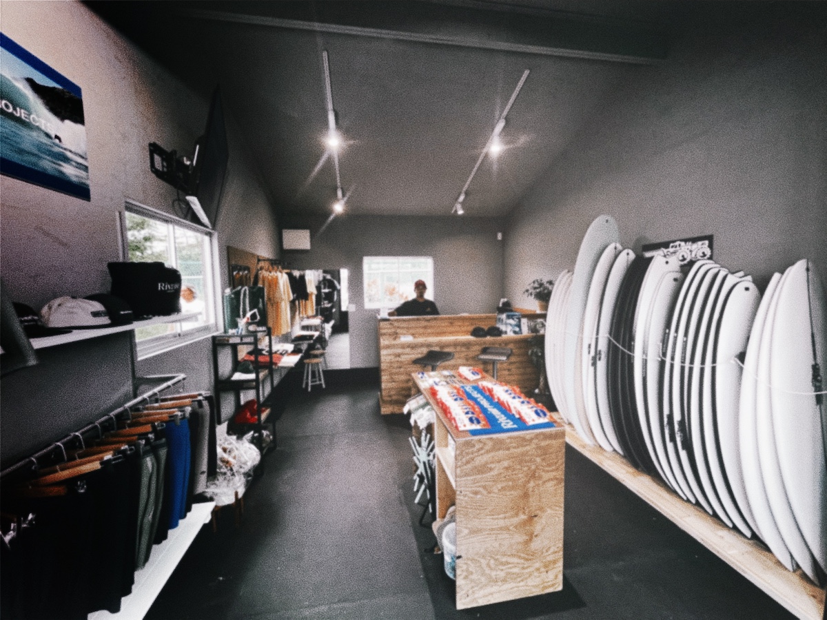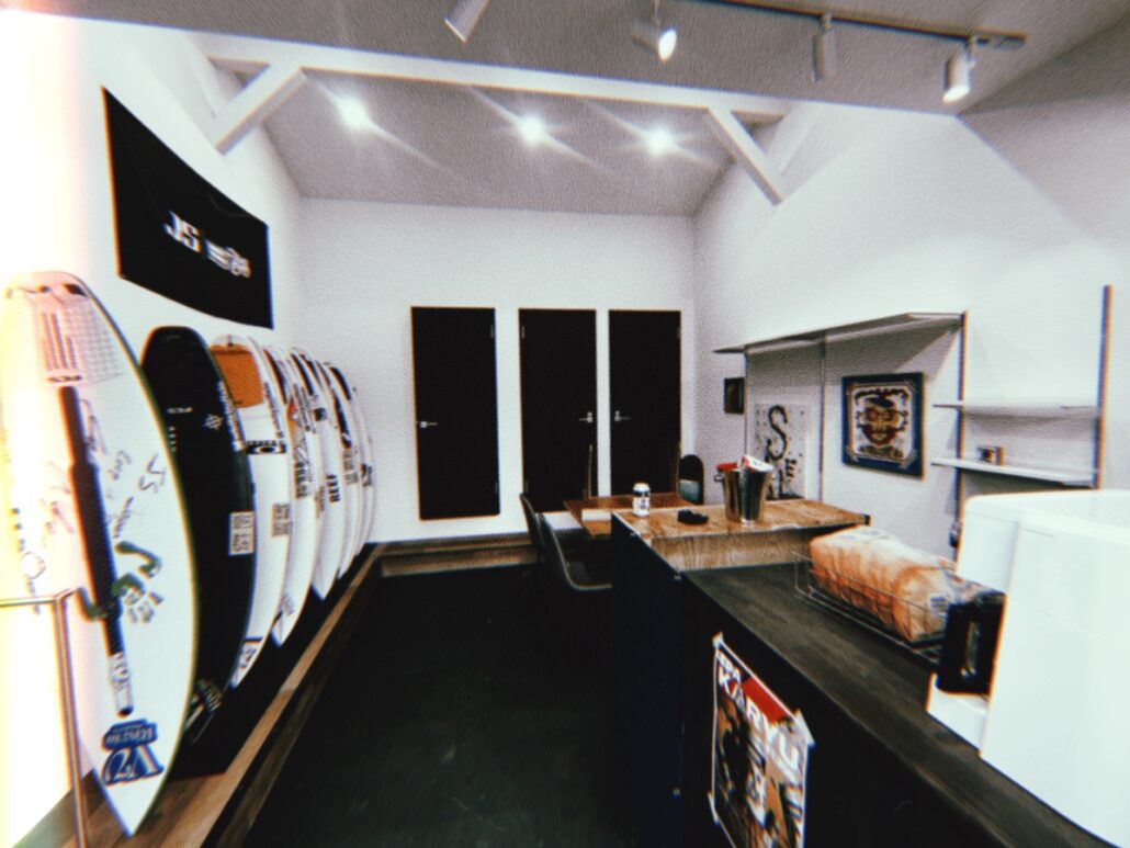 店内の内装や外装は全て大原洋人の父や姉の大原沙莉の結婚相手である神田龍聖がD.I.Yで完成させた愛のこもった建物となっており、入り口からすぐのスペースにはカフェも併設されていることから、初心者から上級者とレベルを問わず、さらにはサーファーでもサーファーでなくても気軽に立ち寄れるスタイルとなっているのがポイント。