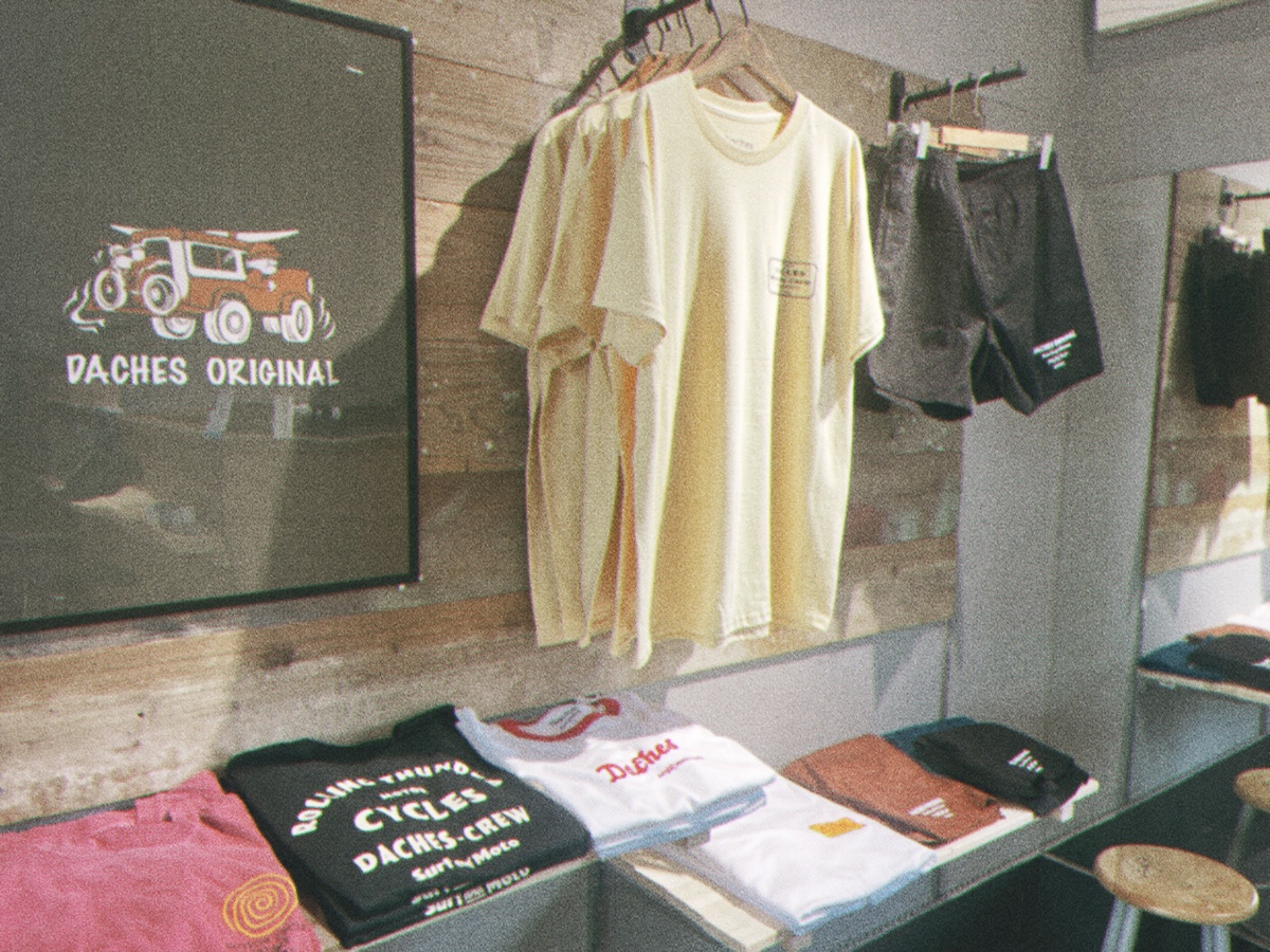 ショールーム”Untitled Surf”には大原洋人の義理の兄である神田龍聖がデザインするバイクとサーフィンをテーマとするオリジナル・ブランド”DACHES ORIGINAL”もラインナップ。
