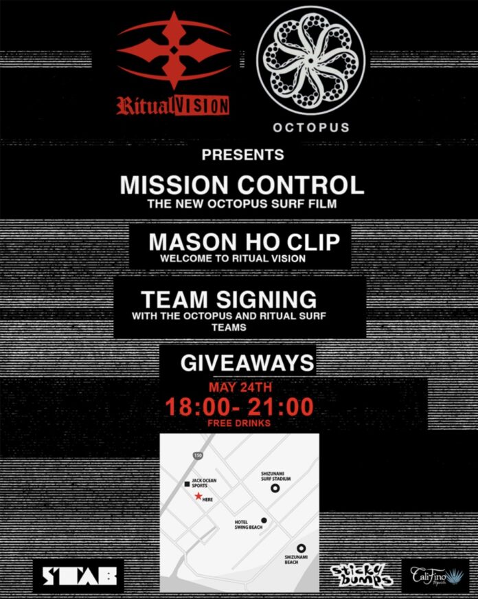 5/24(土)から5/25 (日)に静波サーフスタジアムにて行われるSTAB HIGH のコンテストに合わせて、5/24(土)に日本初上陸となるアイウエアブランド“RITUAL VISION”(リチュアルビジョン) のローンチ記念、RITUALチームライダーMason HoのムービーとOCTOPUSの最新のムービー“MISSION CONTROL”のプレミア上映会が静波にて同時開催されることが決定となった!
