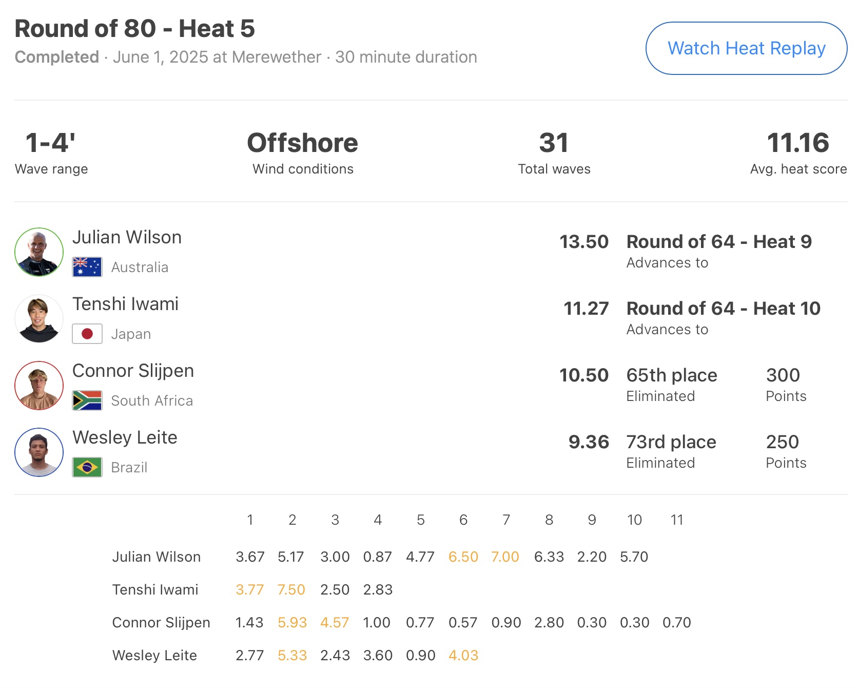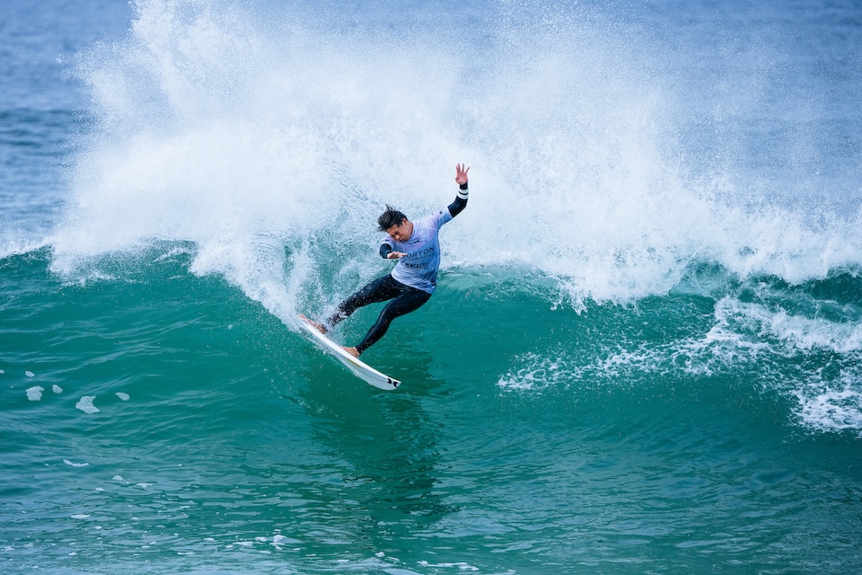 先日オーストラリアのゴールドコースト、バーレイヘッズで開催されたCT第6戦でトライアル優勝で獲得したワイルドカードで本戦に出場し、Filipe Toledoとのエキサイティングなファイナルを展開して準優勝を果たした元CTランキング2位のJulian Wilsonとラウンドオブ80のヒート5で対戦した岩見天獅は、トータルスコア13.50ptをマークして1位でラウンドアップしたJulian Wilsonを相手に、このヒートの最高得点となる7.50ptを叩き出して魅せ場を作り、見事2位でラウンドアップ。