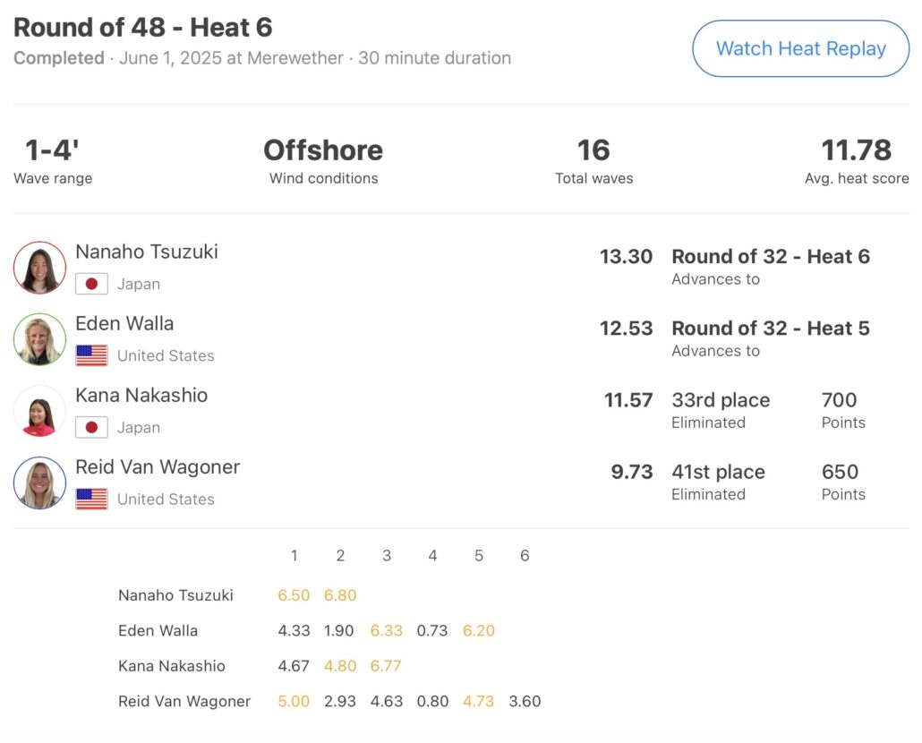 彼女はラウンドオブ48のヒート6で先日フィリピンで開催されたWJCで準優勝を果たし、国内プロツアーでは無敵状態の中塩佳那、アメリカのReid Van Wagoner、Eden Wallaを相手に6.80ptと6.50ptのグッドスコアを2本まとめ上げ、この日のベスト・トータルスコアとなる13.30ptをマークした。