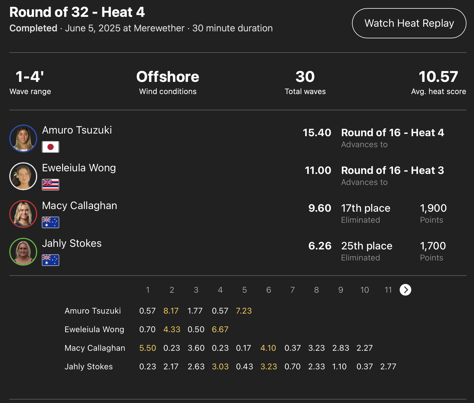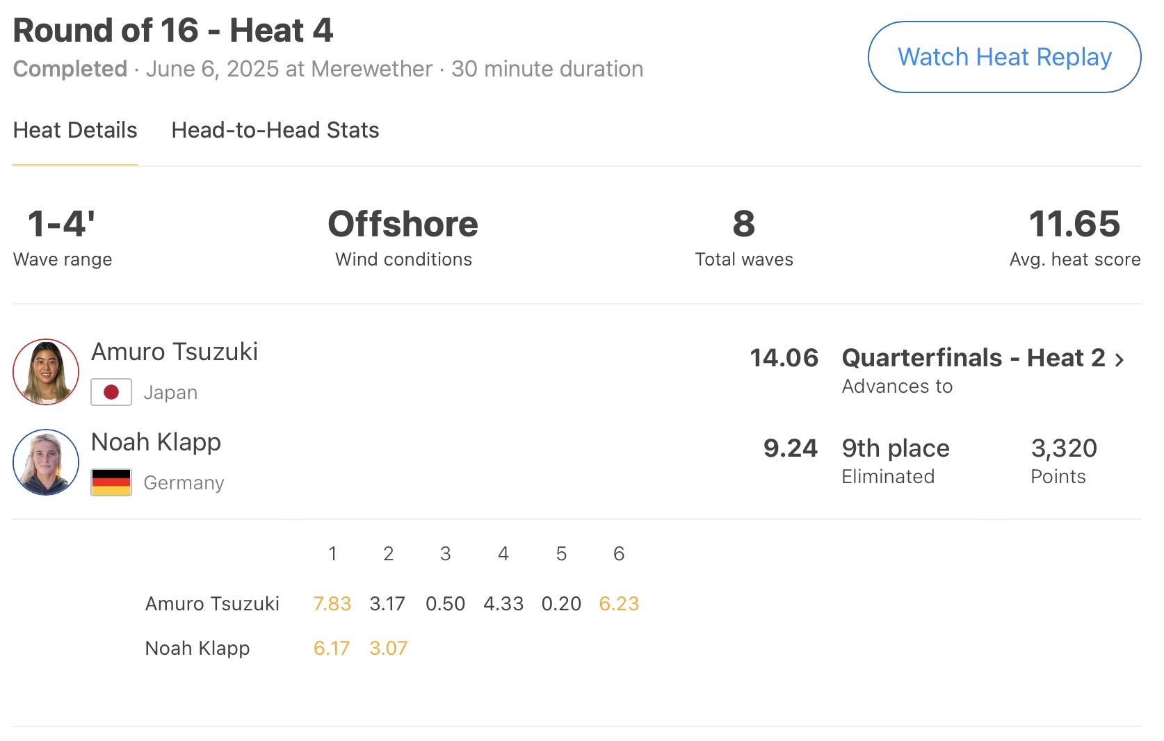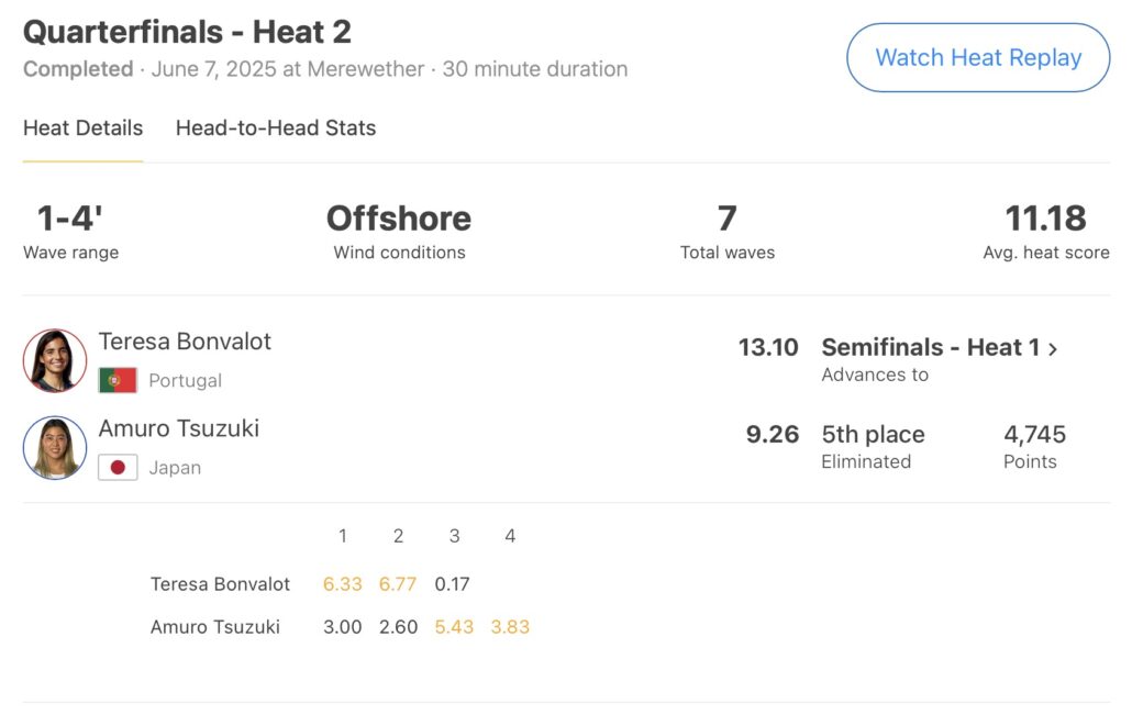 MENSはJacob Wilcox、WOMENSはFrancisca Veselkoが優勝を飾った中、唯一日本代表選手の中でファイナルデイまで勝ち進んでいた注目の都筑有夢路は、クォーターファイナルのヒート2でTeresa Bonvalotを相手に3本目の波でチューブをメイクする素晴らしいライディングを披露したが、チューブから抜けた後のターンでワイプアウトしてしまい、スコアを伸ばすことができず、惜しくもここで敗退。