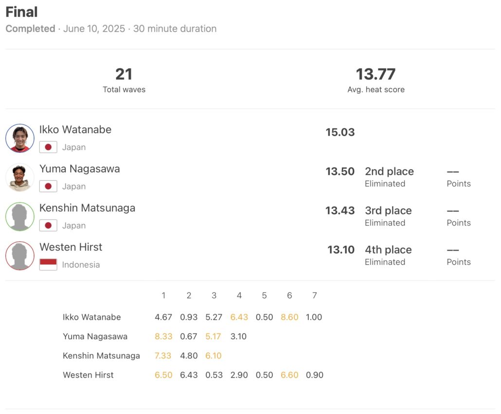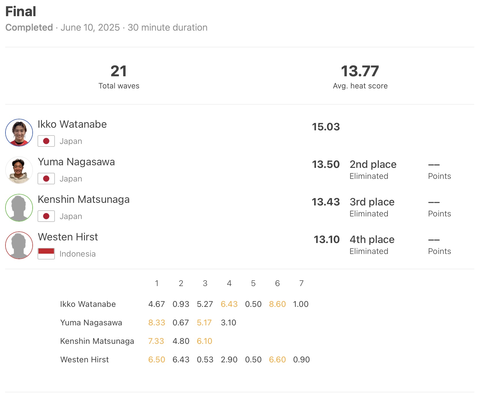 日本時間の6/12(木)21:00の時点で同時開催中のMENS QS6000″Krui Pro”は、ラウンドオブ128のヒート2まで、WOMENS QS6000はこれからスタートとなる予定。