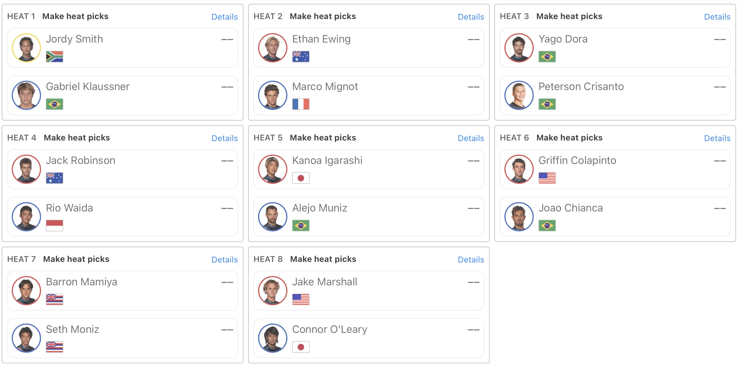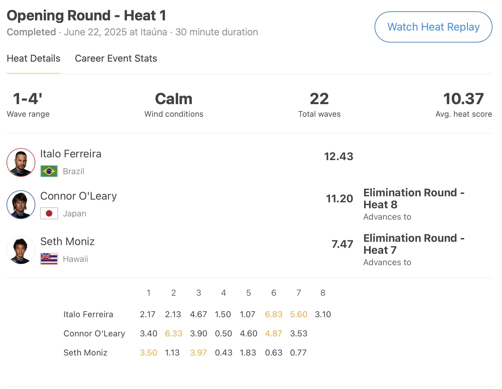 注目の日本代表選手たちの活躍は、ヒート1で6.33ptのグッドスコアをマークしつつもItalo Ferreiraにあと一歩追いつくことができなかったコナー・オレアリーと、ヒート2でトリッキーなコンディションに翻弄されて良い波をつかめないまま終わってしまった五十嵐カノアが共に2位となってイリミネーション・ラウンドへ進出となった。