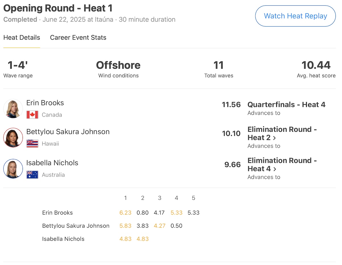 WOMENSルーキーで唯一ミッドシーズン・カットを突破したErin Brooksは、現在トップ5につけているBettylou Sakura JohnsonとIsabella Nicolをエリミネーションラウンドに送り込み、ポルトガルで開催されたCT第3戦以来となるオープニングラウンドのヒート勝利を飾った。
