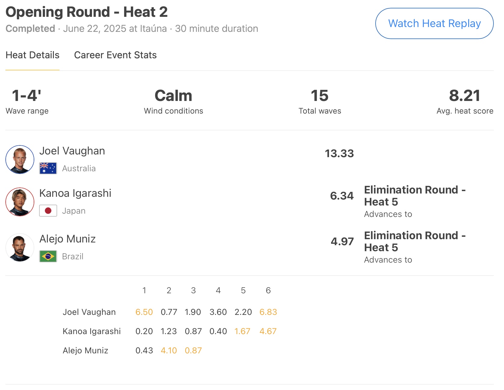 迎えるイリミネーションラウンドでは、五十嵐カノアがヒート5でAlejo Munizと対戦。