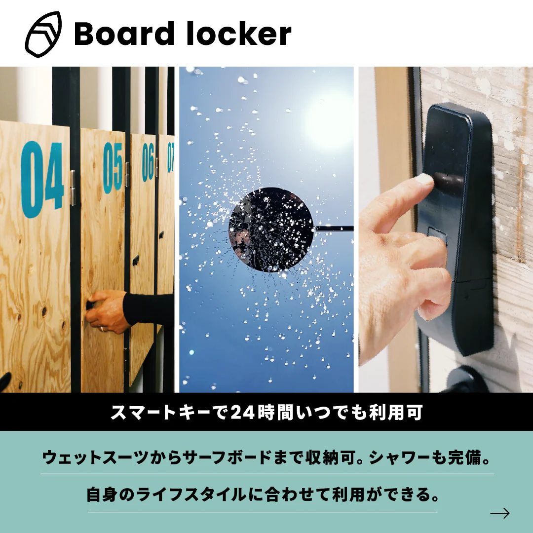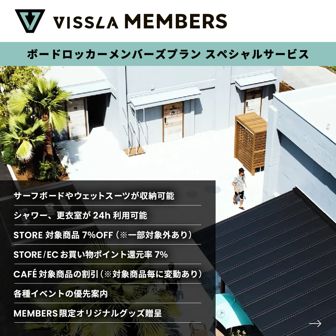 年間を通して安定した波に恵まれる日本指折りのサーフブレイクとして知られる片貝ポイントまで徒歩3分という最高の立地条件にありながら、スマートキーでいつでも自分のライフスタイルに合わせて出し入れ可能なウエットスーツまで収納できるボードロッカーにシャワー、更衣室が24時間好きな時に利用可能な上、併設するVISSLA STOREやVISSLAオンラインストアの対象アイテムが7%オフ、さらにカフェの対象商品の割引(その時によって対象商品に変動あり)、各種イベントの優先案内、さらにはメンバーズ限定オリジナルグッズがもれなくもらえる特典付き!