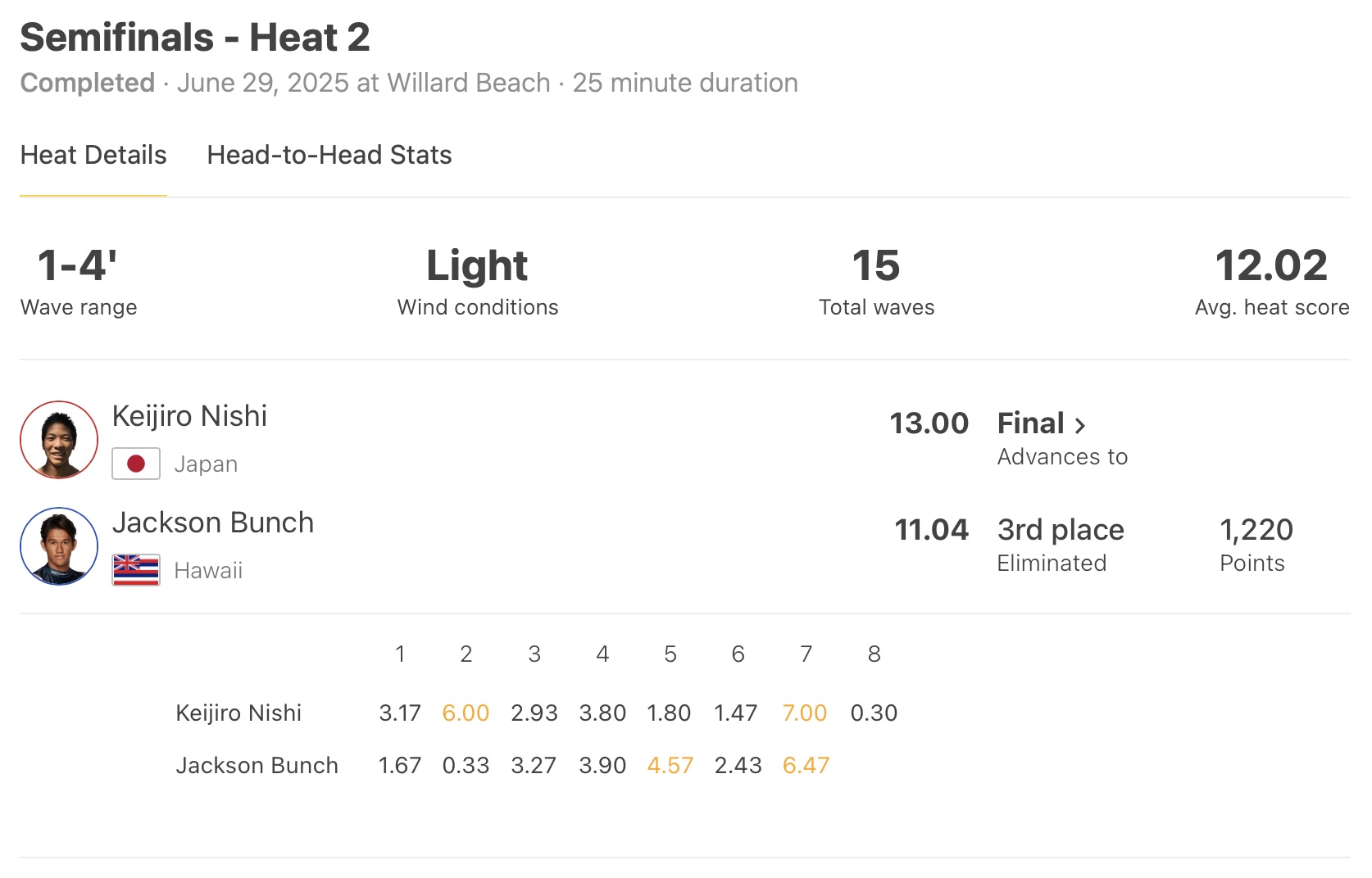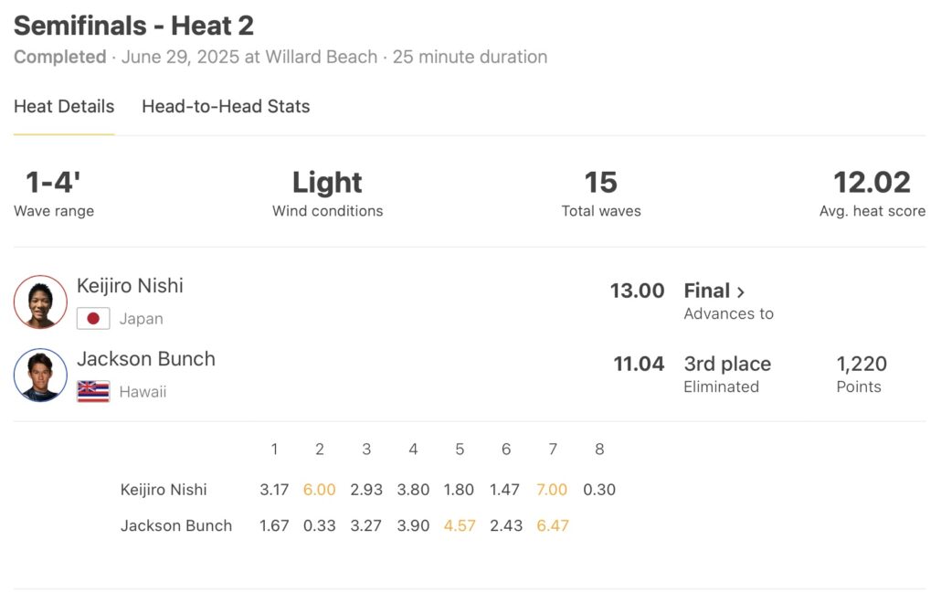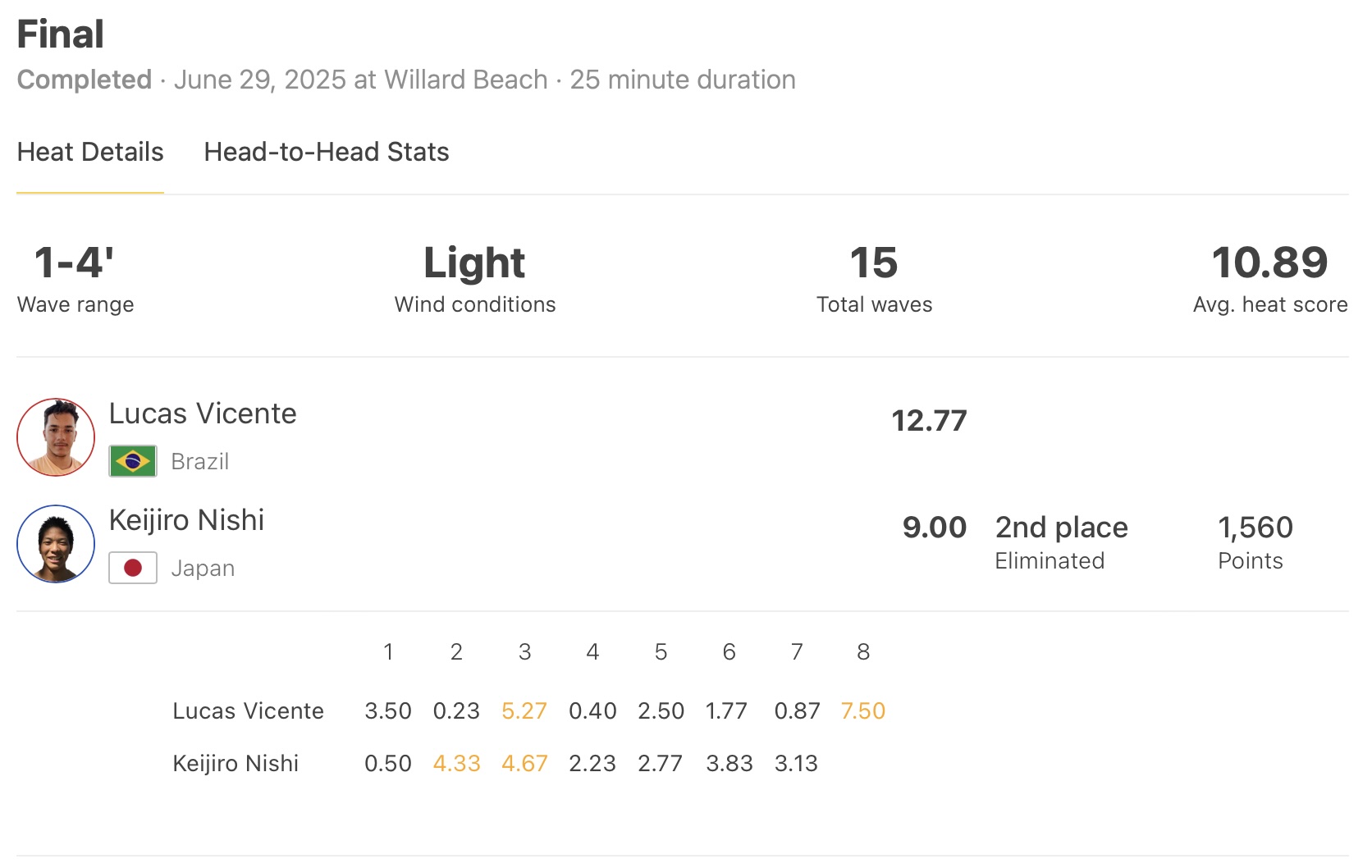ラウンドオブ16とセミファイナルの2度に渡ってCTサーファーのJackson Bunchを抑えて1位でラウンドアップを果たす好調なサーフィンを披露した西慶司郎であったが、ファイナルではハイスコアにつながるポテンシャルの高い波を掴むことができず、ブラジルのLucas Vincenteに逆転できず準優勝となった。