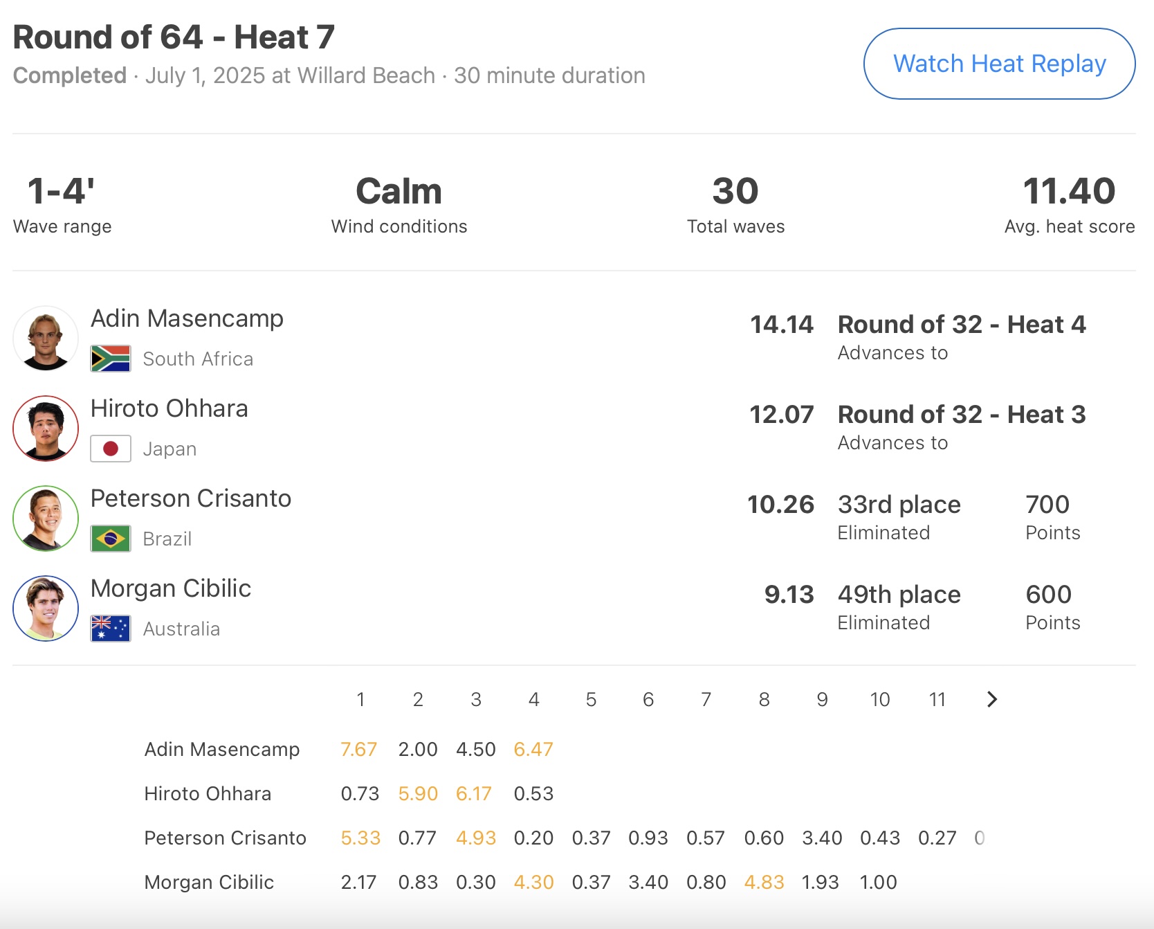 唯一勝ち上がった大原洋人は、迎えるラウンドオブ32のヒート3でDeivid SilvaとMatthew McGillivrayといったCTサーファー2名とハワイ出身の若手トップCSサーファーShion Crawfordと対戦予定。