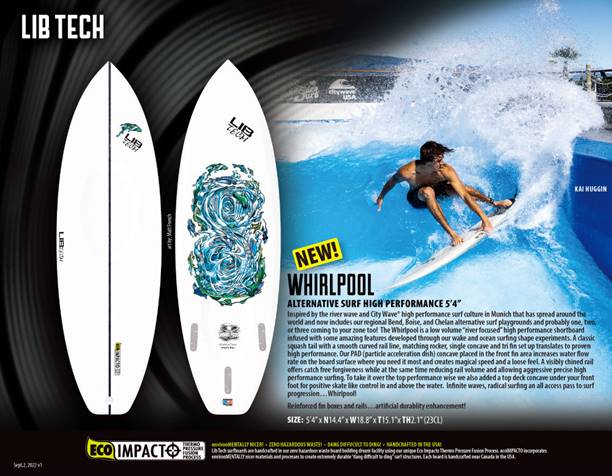 ミュンヘンのリバーウェーブとシティウェーブのハイパフォーマンスサーフ文化に触発され、CITYWAVEは世界中に広まりました。Whirlpoolはローボリュームの リバーフォーカスボードで、トライフィンのセットアップで高いパフォーマンスを発揮します。ボトムに配置された PAD(particle acceleration dish)コンケーブ は水流を増幅させ魔法のようなスピード とルースなフィーリングを生み出します。レールボリュームを減らしアグレッシブで正確なハイパフォーマンスサーフィンを可能にし、更にトップデッキの前足にコンケーブを付けスケートライクなコントロールを実現します。