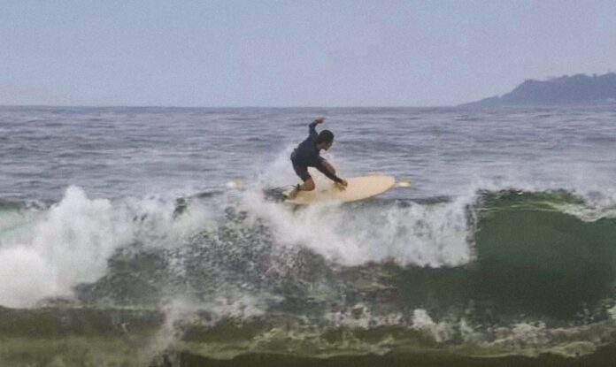 南西の風に強い湘南のウエストサイドにある某サンドバーをホームブレイクとする村上蓮が、ライダブルな胸肩サイズのファンウェイブをDEADKOOKS surfboardsのツインフィッシュ”TORO2″モデルでこの波をクルーズ!