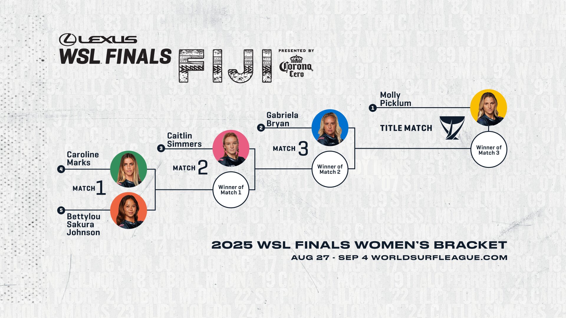 勢いに乗っているMolly Picklumは、ファイナルに組み込まれており、パワフルなサーフィンで今シーズンCTランキング2位に着けているGabriela Bryan、昨年のワールドチャンプCaitlin Simmers、2023年ワールドチャンプCaroline Marks、そしてBetylou Sakura Johnsonを相手に、初のワールドタイトル獲得を狙う。
