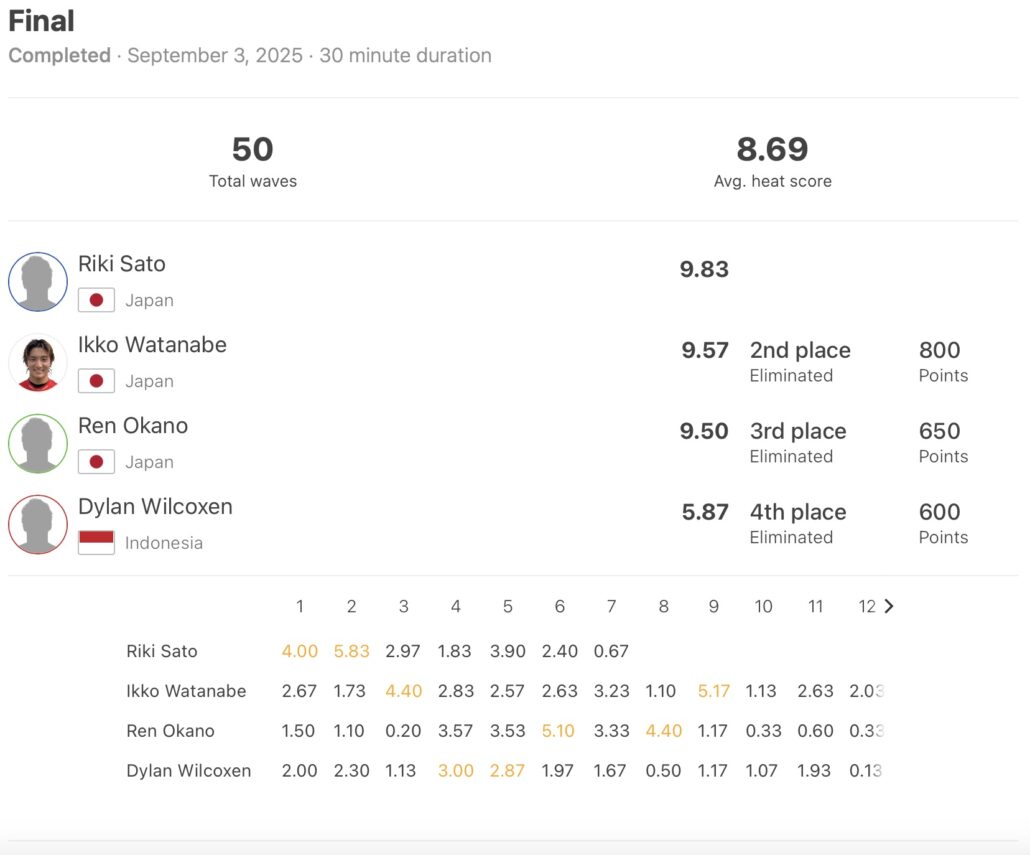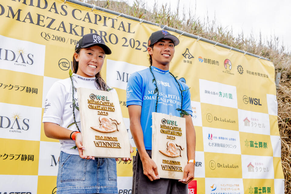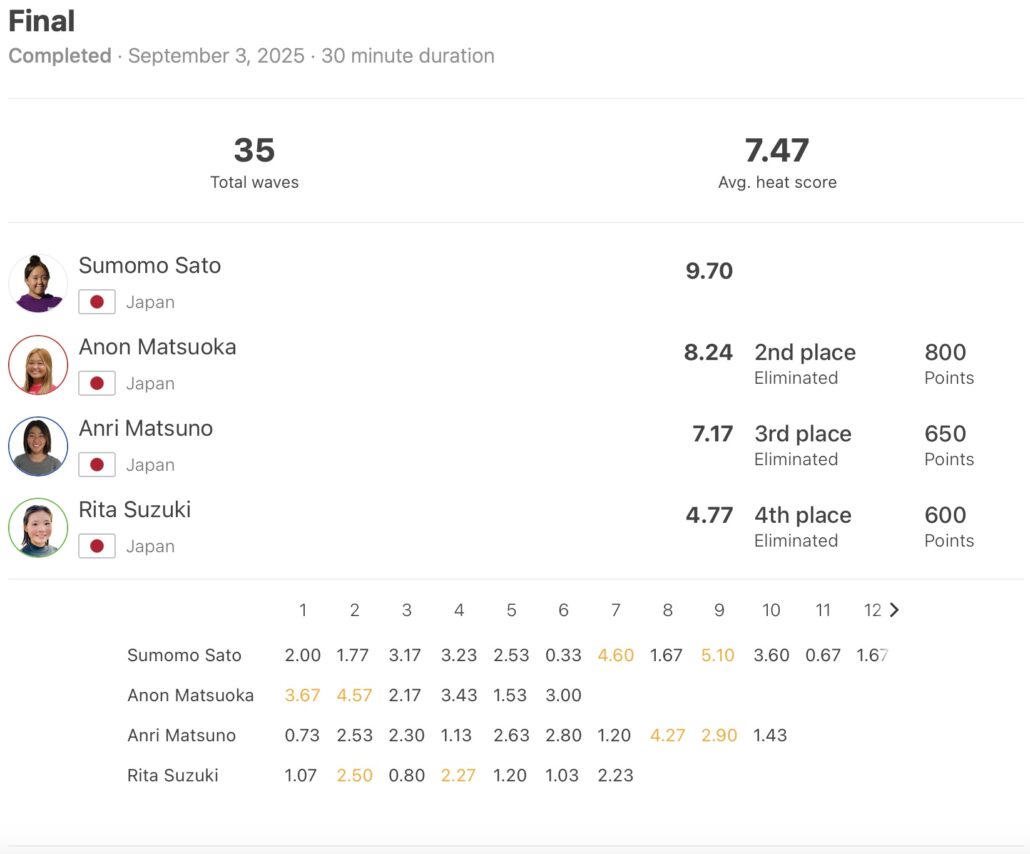 ヒート序盤は松岡亜音が3.67ptと4.57ptをまとめてリードしたものの、じっくりと波を待っていた地元御前崎出身の佐藤季がローカルナレッジを活かした波選びで3.23pt、さらに4.60ptと徐々に差を詰めてプレッシャーをかけ、5.10ptをマークしたライト方向の切れた波が優勝の決め手となった。静波サーフスタジアムで開催されたSリーグS1第2戦でも優勝を遂げた佐藤季が、相手に付け入る隙を与えず見事プロジュニアを制した。Sumomo Sato.