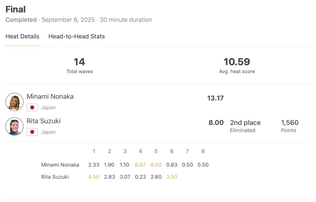 鈴木莉珠と対戦となったWOMENSファイナルでは会場の西側で掴んだ波で6.67ptを叩き出した1本が決め手となり、野中美波が見事優勝を決めた。