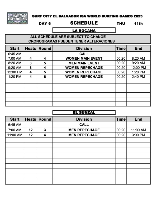 エルサルバドルで開催中のISAワールドサーフィン・ゲームズ(WSG)は日本時間の9/10(水)から9/11(木)早朝にかけてコンテストDAY5が行なわれ、3~4フィートのクリーンなコンディションに恵まれたラ・ボカナではWOMENSメインラウンド3、MENSメインラウンド4、WOMENSリパチャージラウンド3までを、エル・スンサルではMENSリパチャージラウンド2の全ヒートを消化。