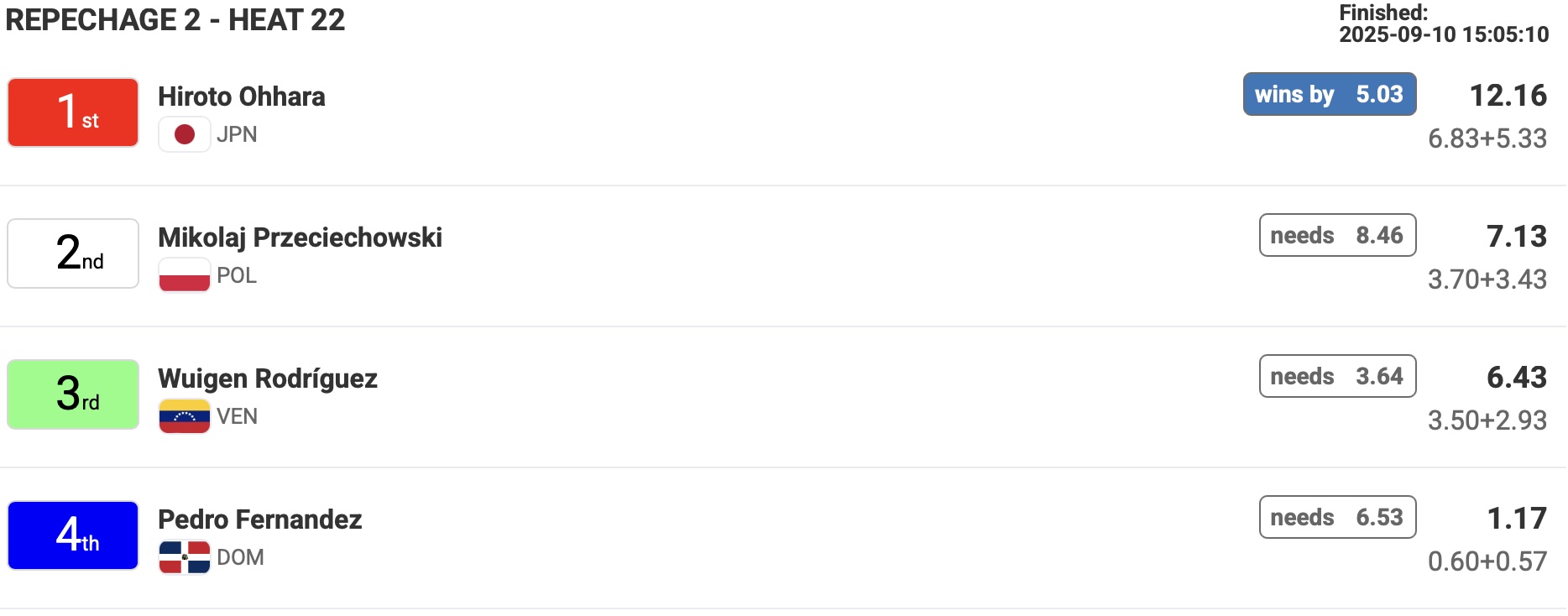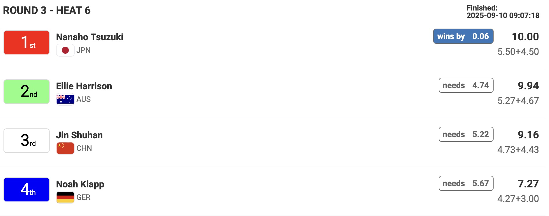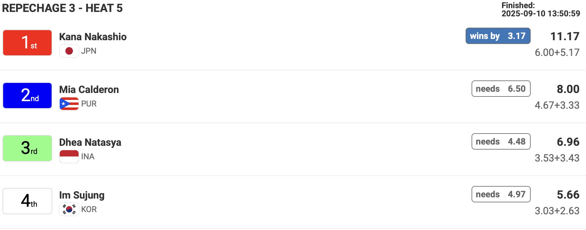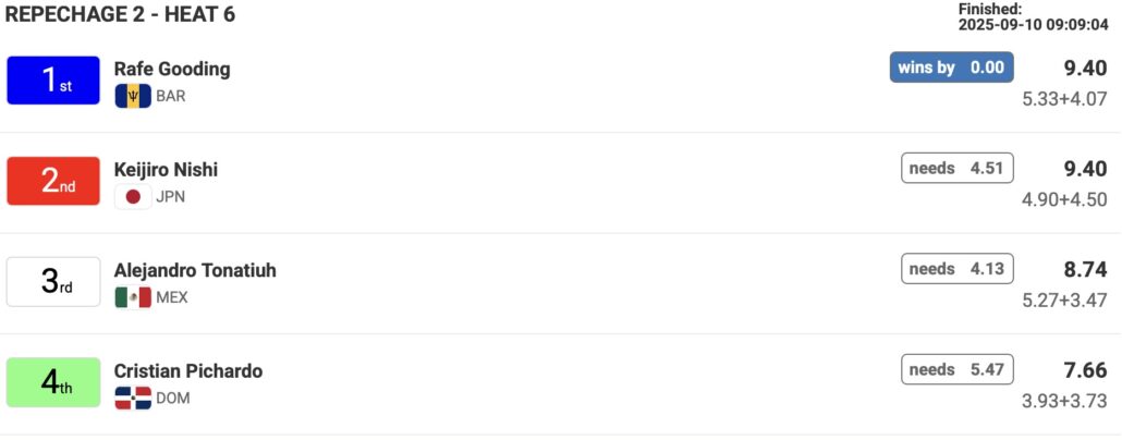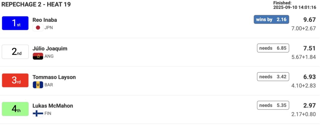 中塩佳那はリパチャージラウンド4のヒート5でElla McCaffray(USA)、Noah Klapp(GER)、Camila Kemp(GER)と対戦。