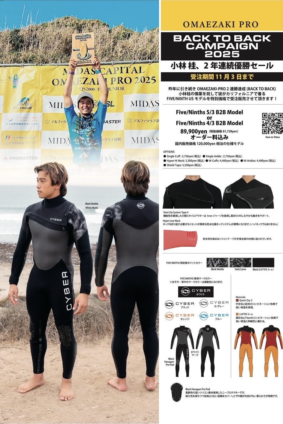 さらに現在、小林桂をサポートするCyber wetsuitsでは小林桂の御前崎プロ2連覇を記念したBack to Backキャンペーンを11/3(月・文化の日)まで開催中!
