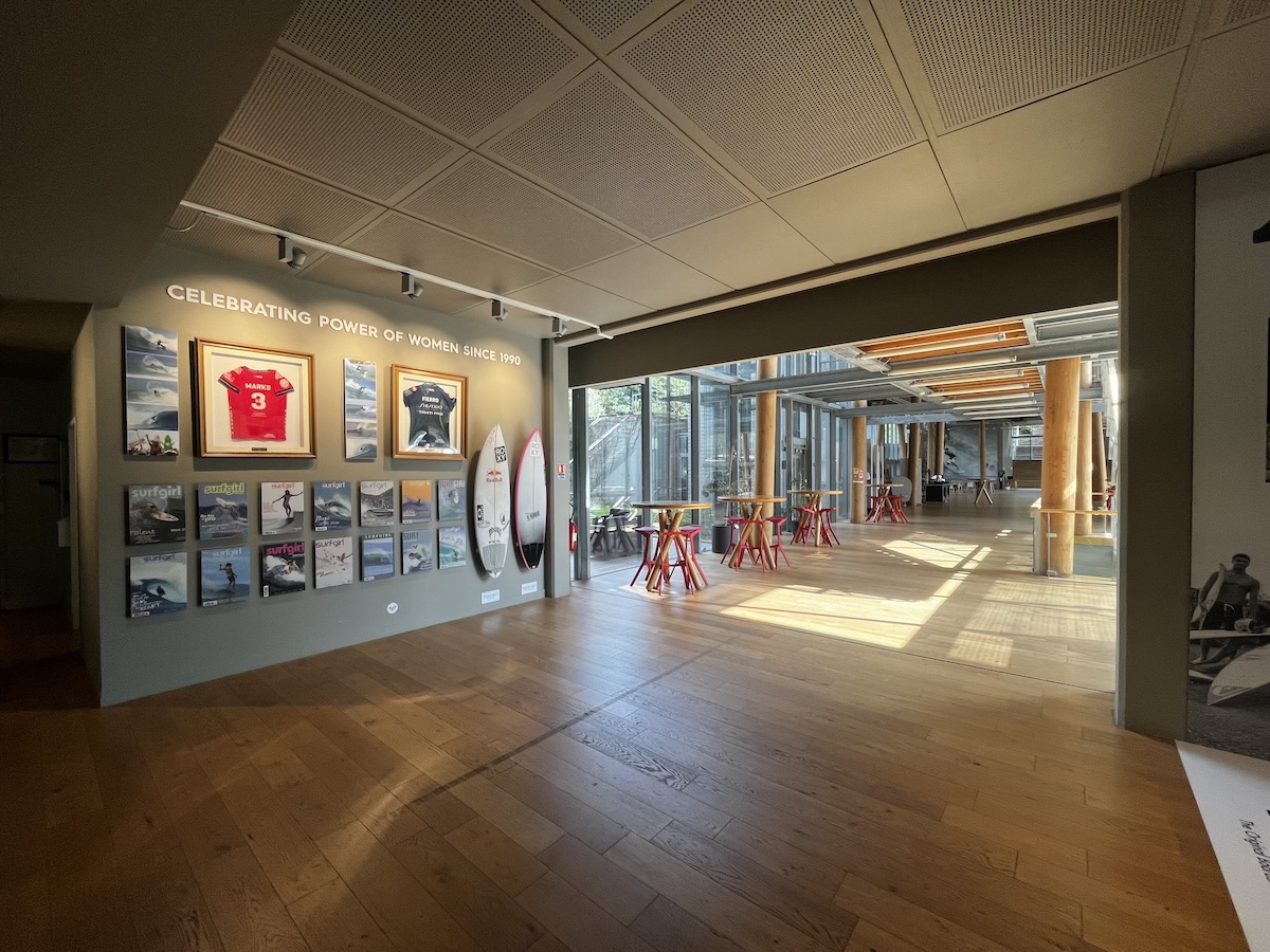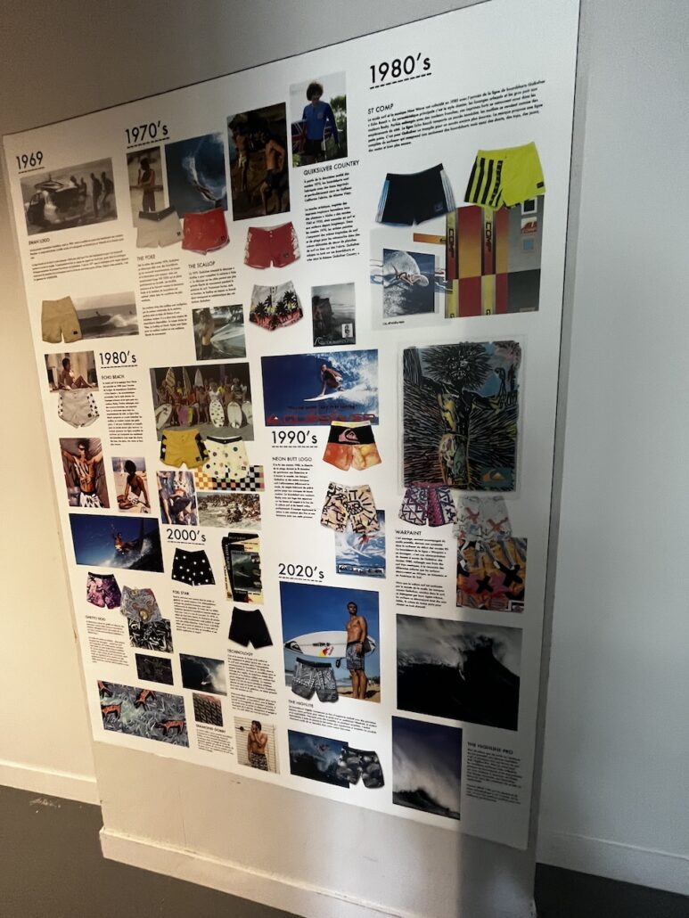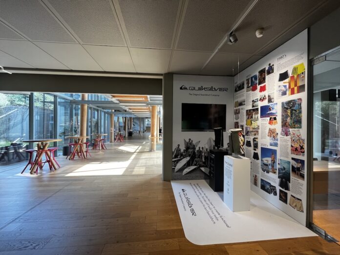 本社の入口を入ってすぐの両サイドには、ワールドチャンプCaroline MarksやVahine FierroといったROXYトップライダーたちの記念すべきジャージや使用サーフボードの数々をはじめ、QUIKSILVERが長年に渡ってその開発に情熱を注ぎ続けるボードショーツの歴史年表が。